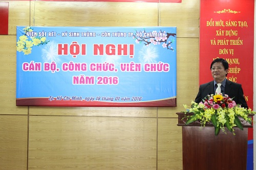Phát biểu khai mạc Hội nghị, PGS.TS. Lê Thành Đồng, ôn lại truyền thống 39 năm hình thành phát triển của đơn vị (18/01/1977 - 18/01/2016). Đồng chí cũng nhấn mạnh mặc dù trong năm vừa qua, Viện đã gặp rất nhiều khó khăn trong việc thực hiện nhiệm vụ do tình hình dịch bệnh ở khu vực Nam Bộ - Lâm Đồng vẫn còn diễn biến phức tạp, các bệnh giun sán, nấm, đơn bào, các bệnh do ngoại ký sinh và côn trùng truyền chưa được quan tâm, đầu tư nghiên cứu cũng như phòng chống đáp ứng nhu cầu; ký sinh trùng sốt rét kháng thuốc; muỗi truyền bệnh sốt rét kháng hóa chất đang sử dụng tại khu vực ven biển Tây Nam Bộ tiếp tục gia tăng; hiện tượng di biến động dân tự do còn phổ biến và rất khó kiểm soát; cơ sở hạ tầng chưa đáp ứng được nhu cầu thực tiễn; thu nhập của CBVC-NLĐ còn thấp nhưng với sự nỗ lực, quyết tâm của toàn đơn vị, Viện đã hoàn thành xuất sắc các chỉ tiêu, nhiệm vụ được Bộ Y tế. Đồng chí cũng kêu gọi toàn thể CBVC-NLĐ phát huy hơn nữa những kết quả đã đạt được và vượt qua mọi khó khăn, đoàn kết nội bộ hoàn thành tốt nhiệm vụ công tác năm 2016.