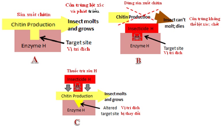 Chitin là một thành phần chính của bộ xương ngoài của côn trùng. Enzyme H là cần thiết cho sản xuất chitin (2A). Để ngăn chặn lột xác, thuốc trừ sâu liên kết với các vị trí đích (2B). Ở một côn trùng kháng, vị trí đích bị thay đổi (2C) và ngăn ngừa thuốc trừ sâu bằng cách liên kết với enzyme.