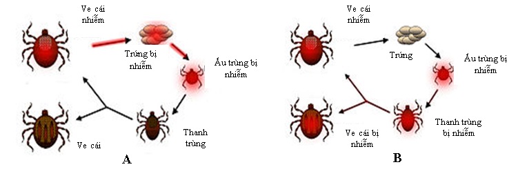 Hình 4. Hình A kiểu lan truyền Trans-ovarial; hình B kiểu lan truyền Trans-stadial [11]