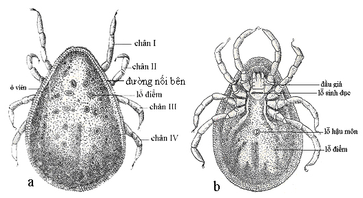 Hình 9.5.Thân ve mềm Argas sp., a. mặt lưng , b. mặt bụng (theo Toumanoff)