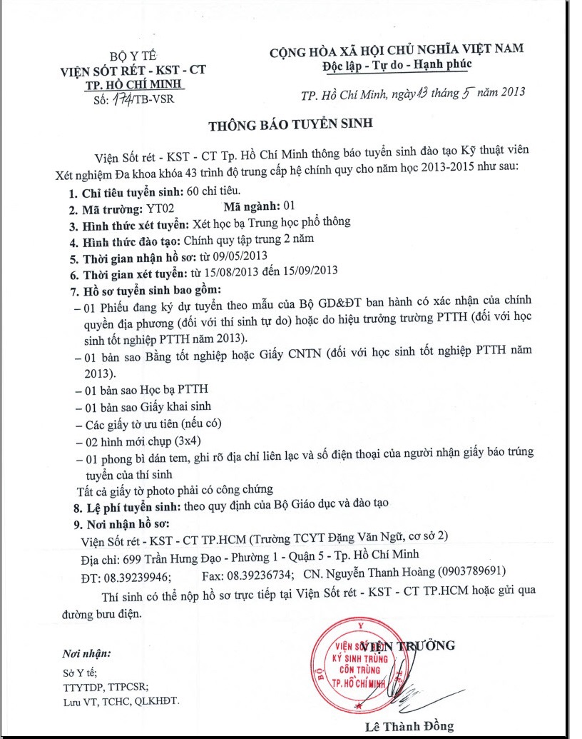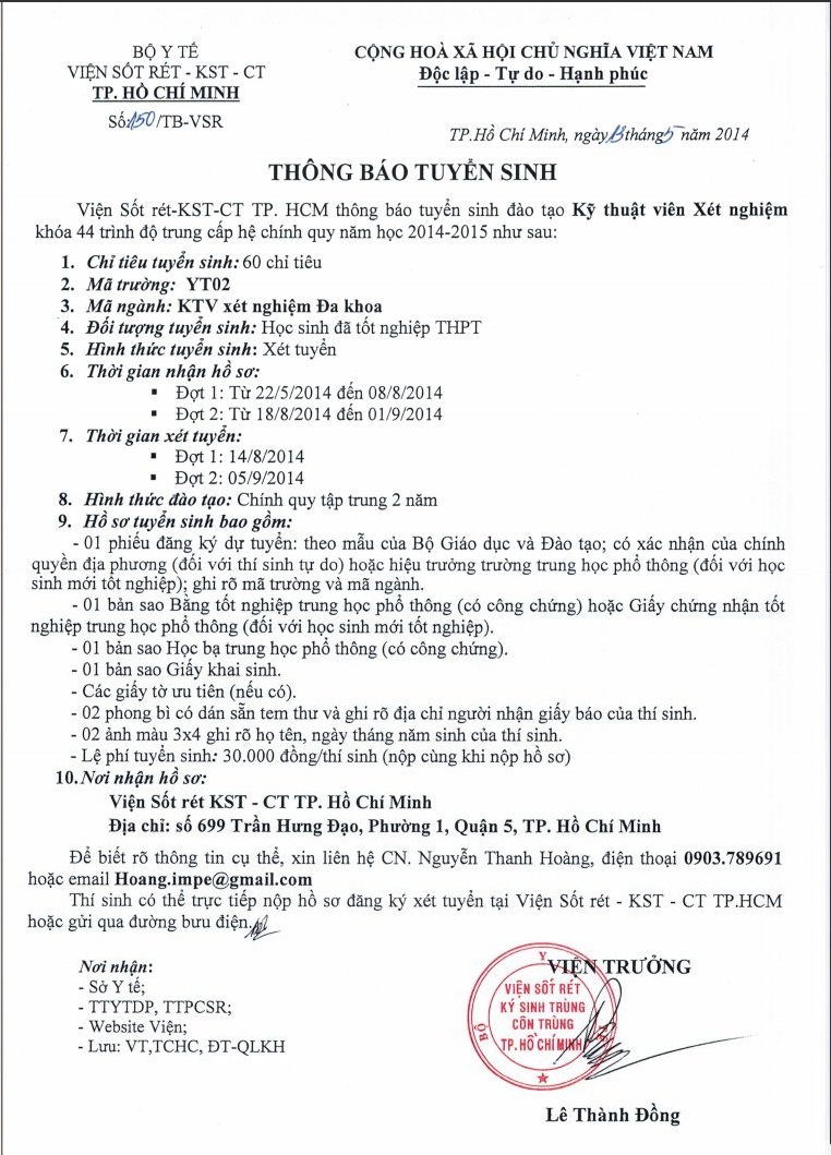 02:20 CH @ 28/07/2014Viện Sốt rét – KST – CT TP. HCM thông báo tuyển sinh đào tạo Kỹ thuật viên Xét nghiệm khóa 44 trình độ trung cấp hệ chính quy nămThông báo tuyển sinh 2013