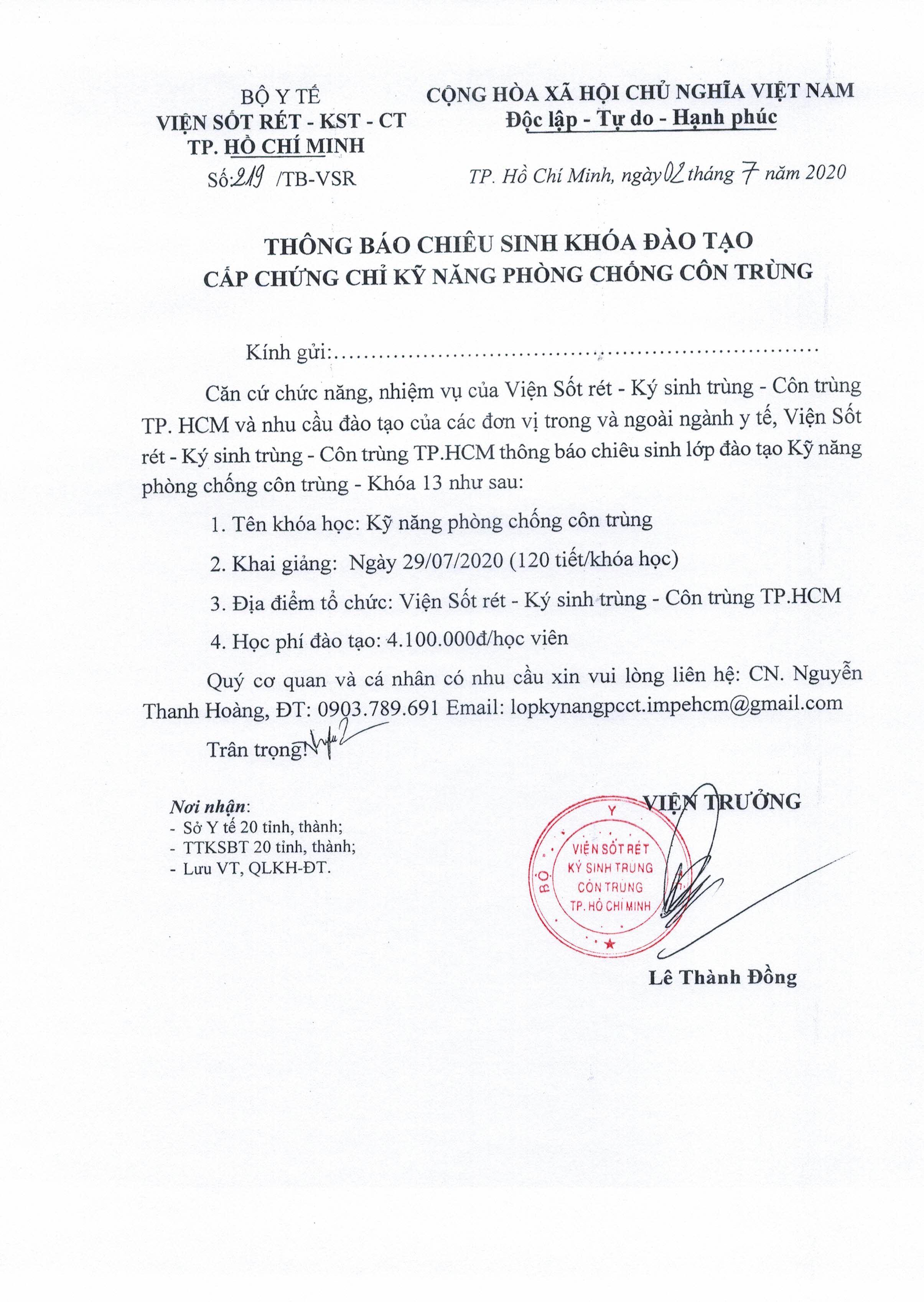 THÔNG BÁO CHIÊU SINH LỚP KỸ NĂNG PHÒNG CHỐNG CÔN TRÙNG KHÓA 13