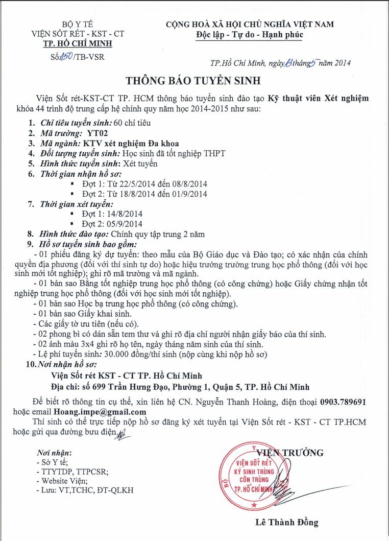 Viện Sốt rét – KST – CT TP. HCM thông báo tuyển sinh đào tạo Kỹ thuật viên Xét nghiệm khóa 44 trình độ trung cấp hệ chính quy năm học 2014 – 2015 như sau: