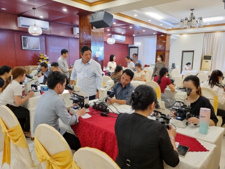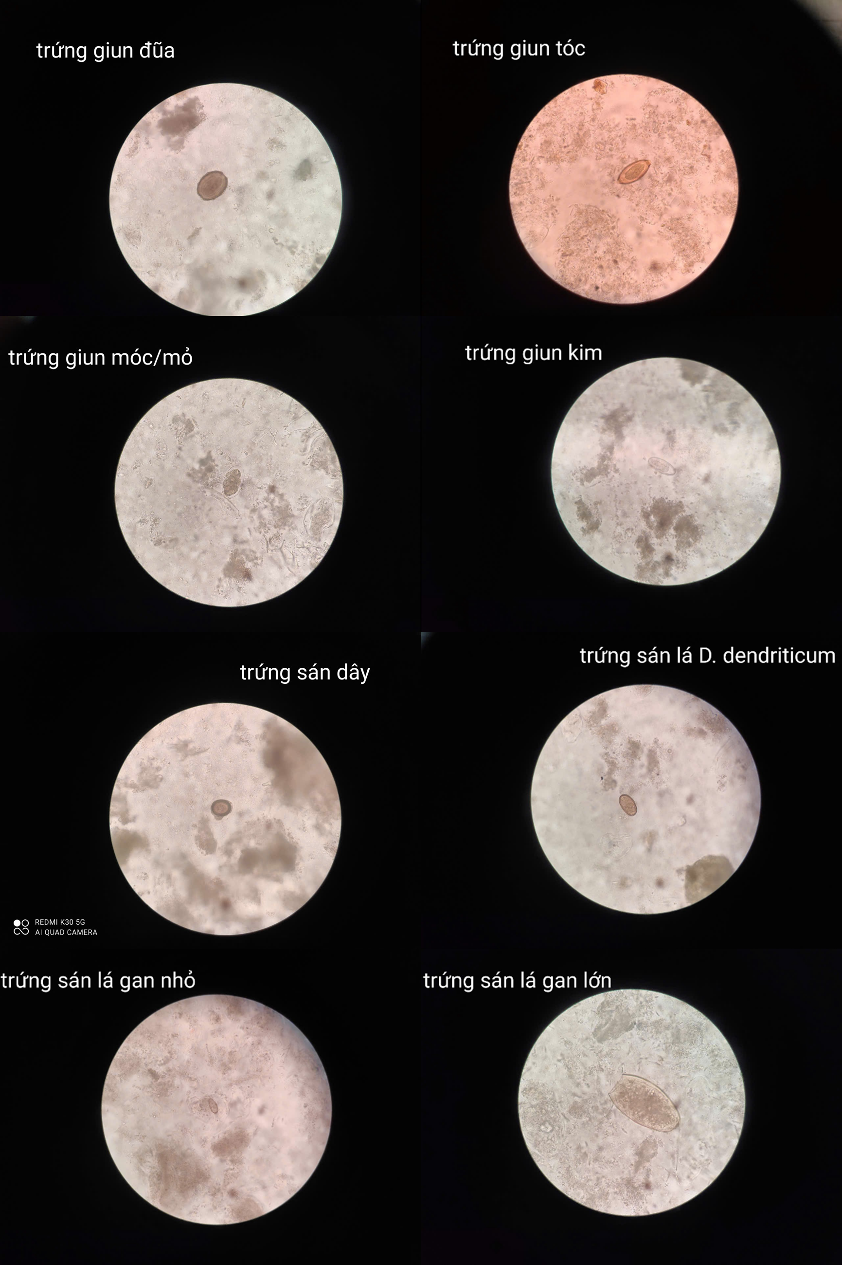 Hình 5. Một số hình ảnh về trứng giun, sán soi dưới kính hiển vi trên lam tiêu bản mẫu trong các buổi thực hành của các lớp đào tạo, tập huấn liên quan xét nghiệm giun, sán, nấm, đơn bào.