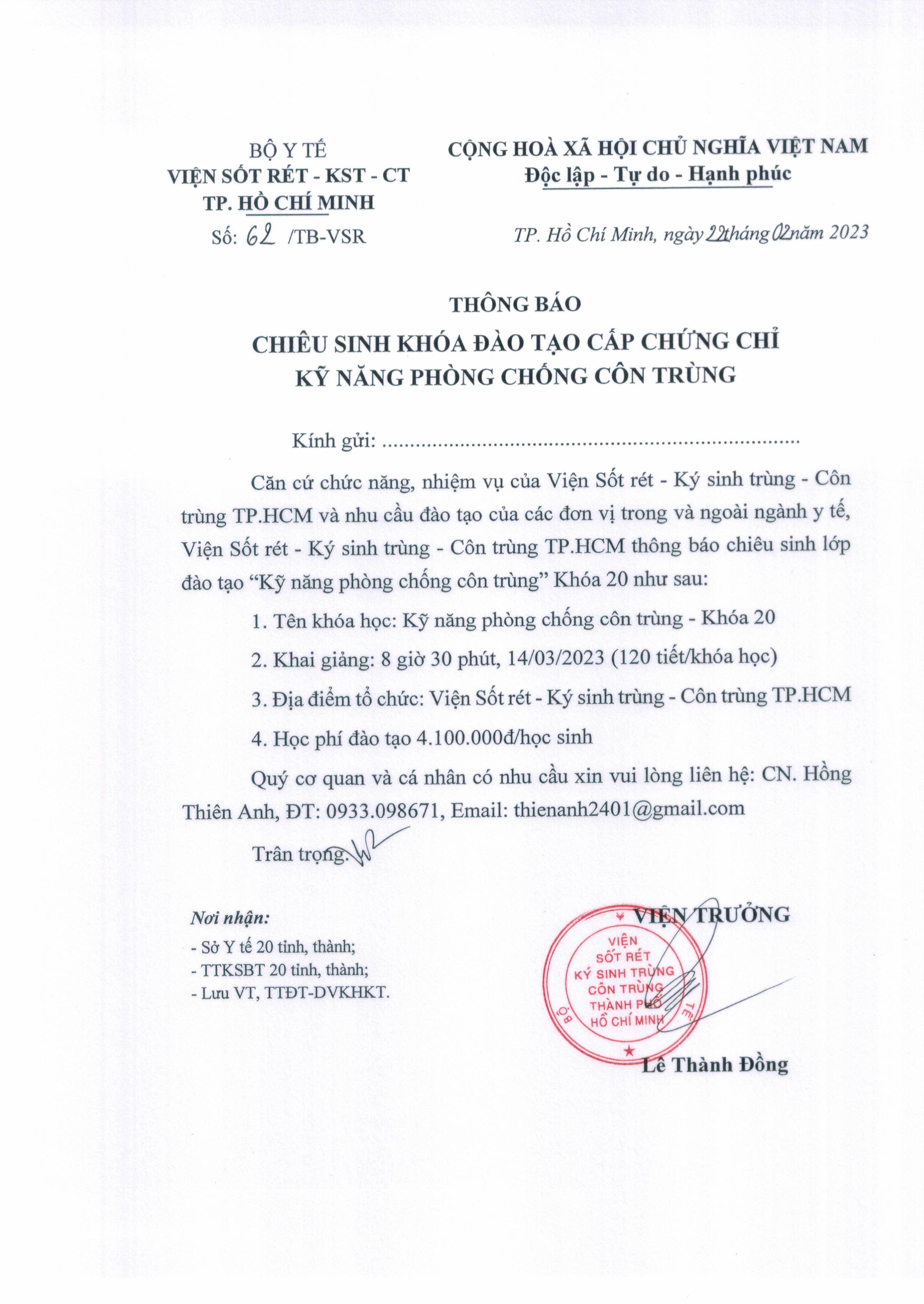 THÔNG BÁO CHIÊU SINH LỚP kỸ NĂNG PHÒNG CHỐNG CÔN TRÙNG - KHÓA 20