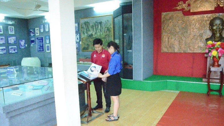 Đoàn tìm hiểu về các hiện vật trưng bày tại nhà lưu niệm của Khu di tích