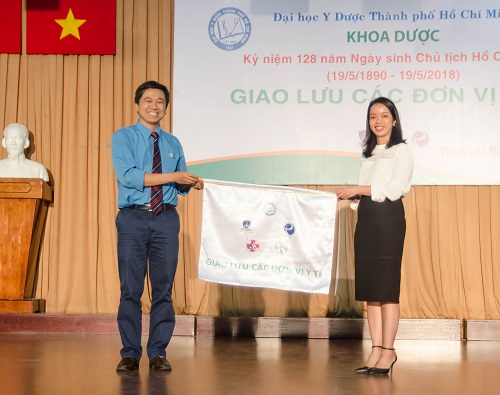 PGS. TS. Trương Ngọc Tuyền, chủ tịch Công đoàn khoa Dược đại học Y Dược TP.HCM trao cờ cho ThS. Nguyễn Thị Yến, đại diện cho đơn vị đăng cai năm 2019 là Viện Sốt rét - Ký sinh trùng - Côn trùng TP. HCM.