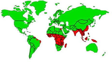 (Các khu vực màu đỏ cho thấy sự phân bố địa lý của bệnh giun chỉ bạch huyết)