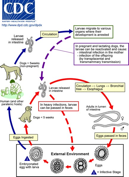 Con người trong quá trình tiếp xúc ăn phải ấu trùng giun đũa chó, mèo. Sau khi xâm nhập cơ thể người (chủ yếu qua đường tiêu hóa), nó sẽ chui qua thành ruột non, theo đường máu đi đến các cơ quan nội tạng khác như gan, tim, phổi, mắt.