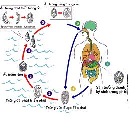 1. Sán lá phổi đẻ trứng, trứng theo đờm qua họng ra ngoài hoặc theo phân khi nuốt đờm, trứng rơi xuống nước.