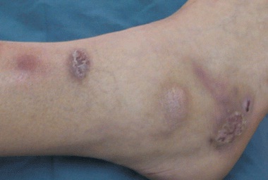 Thương tổn ở da xuất hiện là những gôm, cục sẩn nổi gờ trên mặt da ở những vị trí khác nhau, nhưng phần lớn ở vùng da hở cẳng chân, cánh tay. Đặc biệt gôm sẩn mọc trên đường bạch huyết. Những gôm, sẩn cục phát triển nhanh, lúc đầu thì cứng di động không đau. Sau đó thì mềm thành mủ, thường đau và không di động. Sự hoá mủ bắt đầu từ bề mặt và điểm giữa của gôm dẫn đến gôm mềm nhũn ở giữa còn bờ viền xung quanh thì hơi cứng. Khi chích nặn có ít mủ hơi quánh, màu hơi vàng, không có kén ngòi như viêm da mủ, đây cũng là hình ảnh đặc trưng của bệnh. Tổn thương có thể tiến triển thành áp xe nhỏ hoặc áp xe lớn nằm sâu dưới da, có màu hồng nhạt, khó tự vỡ mủ. Khi chích nặn thì thường đặc quánh như dầu với màu vàng chanh.