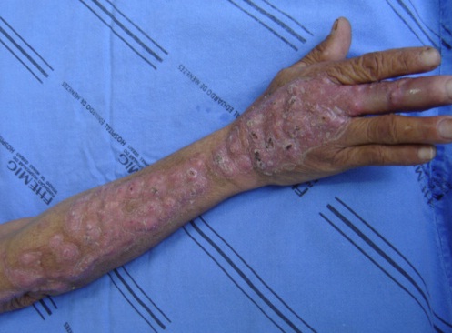 - Thể lan tràn: Rất hiếm gặp,tổn thương nguyên phát thường không ghi nhận được hoặc tổn thương nguyên phát ở phổi hoặc cơ quan khác. Nhiều cục dưới da xuất hiện đồng thời rải rác trên cơ thể trong cùng một thời gian,các cục này có tính chất và tiến triển giống cục trong thể da và bạch huyết, cuối cùng những vết loét đóng vảy mãn tính. Vi nấm di chuyển đến bề mặt xương, tủy xương, hệ thần kinh trung ương, phổi thận, cơ quan sinh dục, dịch hoàn, vú.