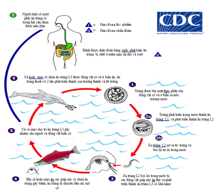 Giun trưởng thành ký sinh dạ dày của các loài động vật có vú ở biển và đẻ trứng, trứng theo phân ra ngoài. Trứng phát triển trong môi trường nước (1) thành ấu trùng L1 và L2 (2a); ấu trùng L2 được nở ra từ trứng và bơi lội tự do trong nước (2b); Ấu trùng L2 bị các loài giáp xác ăn và phát triển thành ấu trùng L3 có khả năng gây bệnh (3); khi cá và mực ống ăn các loài giáp xác có chứa ấu trùng L3, ấu trùng sẽ di chuyển từ ruột đến các mô trong khoang phúc mạc và lớn lên dài khoản 3 cm (4), khi ấu trùng chết sẽ di chuyển đến các mô, cơ. Cá và mực duy trì ấu trùng L3 gây nhiễm cho người và động vật có vú biển (5); khi động vật có vú ở biển ăn cá hoặc mực có chứa ấu trùng L3, ấu trùng thoát vỏ 2 lần phát triển thành con trưởng thành và con cái đẻ trứng (6); Người bị nhiễm bệnh do tình cờ nuốt phải ấu trùng có trong hải sản sống hoặc chưa được nấu chín (7). Sau khi ăn phải, ấu trùng ấu trùng xâm nhập vào niêm mạc dạ dày và ruột, gây ra các triệu chứng của anisakiasis.