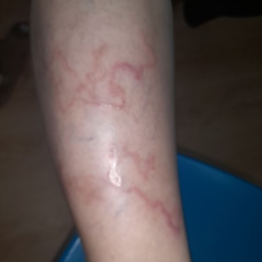 - Ngứa, nổi mẩn dài lên khỏi mặt da, những nốt sần đỏ theo đường vằn vèo, có nổi gờ nhẹ, sờ thấy và dễ nhìn thấy ở ngoài da, di chuyển nhanh chóng