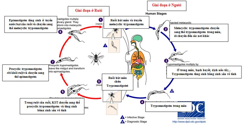 Về hình thể: ở người Trypanosoma có dạng Trypomastigote, hình thoi, dài 20μm. Dạng này sống trong máu, ngoài tế bào, có thể gặp chúng trong các hạch, trong dịch não tủy. Ở ruồi Glossina, ký chủ trung gian và trong môi trường nuôi cấy in vitro, Trypanosoma có dạng epimastigote và promastigote.