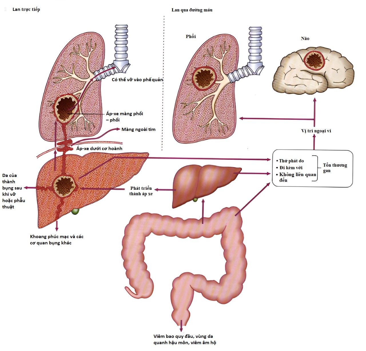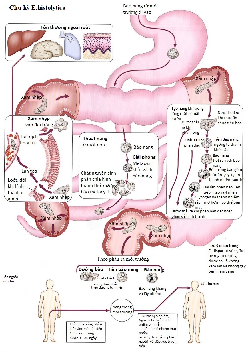 E.histolytica có thể gây bệnh tại đại tràng hoặc một số bệnh lý ngoài ruột như áp xe gan, ổ bụng, màng phổi…