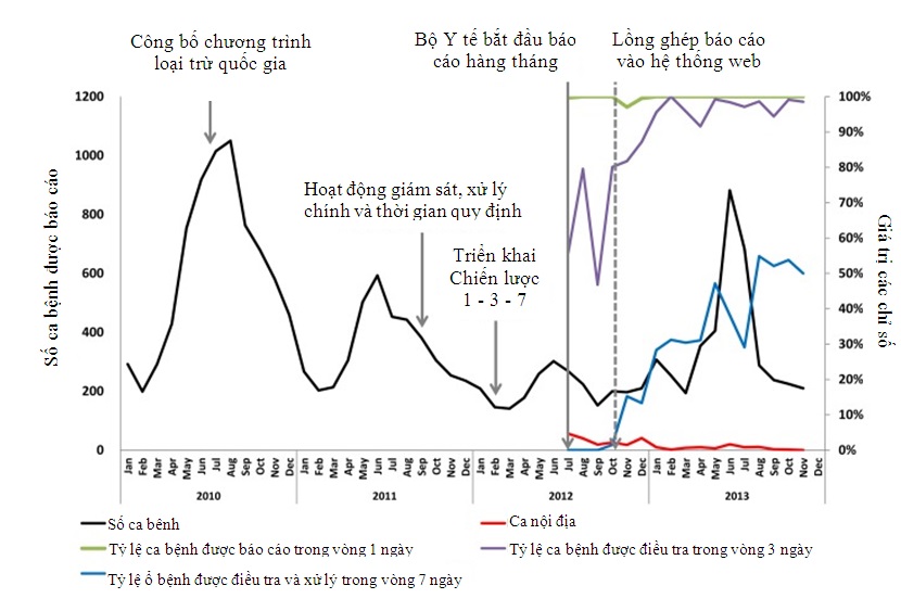 Sau khi công bố Chương trình loại trừ sốt rét quốc gia vào tháng 7 năm 2010 [9], Trung tâm kiểm soát bệnh truyền nhiễm của Trung Quốc ban hành Kế hoạch chuyên môn về loại trừ sốt rét vào tháng 9 năm 2011 [13], trong đó xác định các hoạt động chính trong giám sát và xử lý sốt rét trong giai đoạn loại trừ và khung thời gian thực hiện các hoạt động dự kiến. Mô hình “1 - 3 - 7” đã được thông báo trên toàn quốc vào đầu năm 2012. Tháng 7 năm 2012, Bộ Y tế triển khai báo cáo hàng tháng. Tháng 10 năm 2012, báo cáo hàng tháng được lồng ghép vào hệ thống thông tin phòng chống và kiểm soát bệnh truyền nhiễm qua website của Trung Quốc. Sau khi Bộ Y tế thực hiện báo cáo hàng tháng vào tháng 7 năm 2012, thời hạn thực hiện giám sát và xử lý sốt rét được cải thiện đáng kể, đặc biệt là trong điều tra ca bệnh. Báo cáo ca bệnh cũng luôn luôn được thực hiện trong vòng một ngày vì đây là thời gian theo yêu cầu của pháp luật. Trong suốt thời gian còn lại của năm 2012 và năm 2013, tỷ lệ các trường hợp điều tra trong vòng ba ngày tăng đáng kể từ khoảng 55% đến gần 100% (Hình 4). Trong khi đã có những cải thiện về thời gian điều tra và xử lý ổ bệnh.