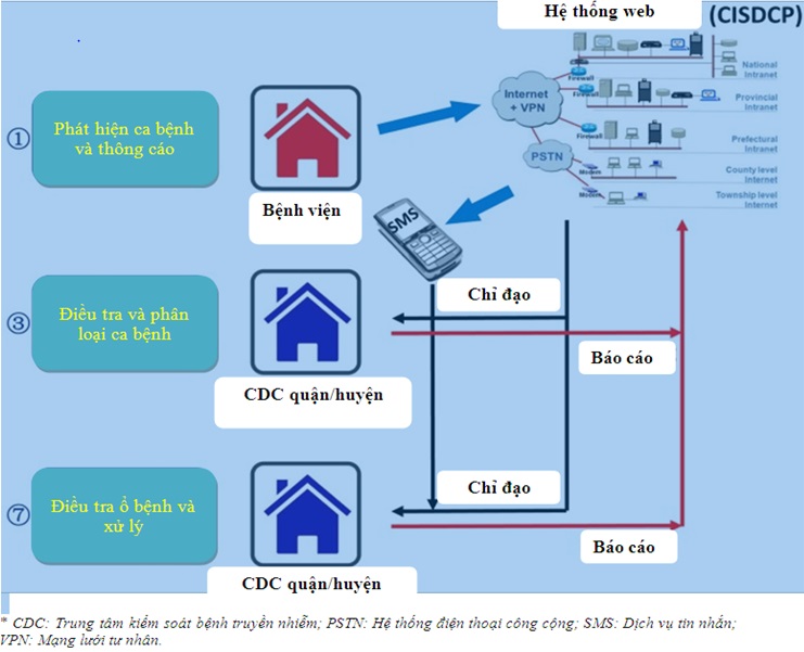 Để truyền đạt thông tin, hệ thống thông tin phòng chống và kiểm soát bệnh truyền nhiễm qua website của Trung Quốc sẽ thống kê tóm tắt ba chỉ số (ví dụ, tỷ lệ ca bệnh được báo cáo trong một ngày, được điều tra trong ba ngày, và đã xử lý trong bảy ngày) và phản hồi lại cho một số cấp hành chính (Hình 3). Số liệu hàng ngày được nhân viên Trung tâm kiểm soát bệnh truyền nhiễm tuyến quận/huyện - người theo dõi ca bệnh và cơ sở y tế báo cáo ca bệnh đó đối chiếu và xác nhận. Ở tuyến tỉnh, người quản lý chương trình loại trừ bệnh sốt rét tỉnh hàng tuần sẽ báo cáo phân tích ca bệnh; báo cáo này gồm một báo cáo vắn tắt về điều tra ca bệnh. Báo cáo phân tích thực hiện mô hình “1 - 3 - 7” được Bộ Y tế tổng hợp hàng tháng và chuyển cho tất cả các Sở Y tế các tỉnh, cho Viện các bệnh ký sinh trùng quốc gia để giám sát và đánh giá. Ngay sau khi việc điều tra và xử lý ca bệnh hoàn tất, sẽ báo cáo vào hệ thống thông tin lớn hơn để cung cấp thông tin phản hồi quan trọng về kết quả xử lý đối với từng ca bệnh. Nhiều chương trình phòng chống dịch bệnh muốn có hệ thống thông tin phản hồi như vậy, trong đó tất cả các cấp trong hệ thống được nhắc nhở về trách nhiệm của mình, đồng thời qua đó cũng có thể theo dõi việc thực hiện của họ.