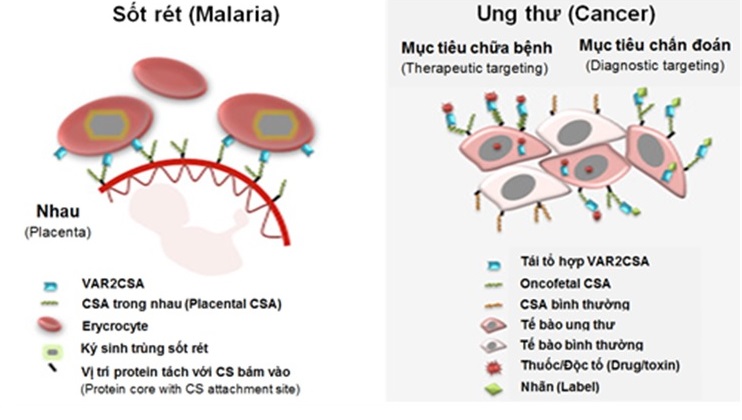 Điểm nổi bật - Nhau thai và tế bào ung thư đều tạo ra oncofetal chondroitin sulfate như nhau - Oncofetal chondroitin sulfate được tìm thấy ở proteoglycan trong tế bào ung thư - Protein tái tổ hợp VAR2CSA phát hiện những thay đổi của chondroitin oncofetal - Có thể hướng đến mục tiêu điều trị ung thư ở người một cách rộng rãi bởi hợp chất thuốc sốt rét VAR2CSA trong cơ thể. Tóm tắt Ký sinh trùng sốt rét Plasmodium falciparum trong tế bào hồng cầu trình diện các protein sốt rét VAR2CSA. VAR2CSA liên kết với một loại chondroitin sulfate (CS) nhất định diễn ra đặc biệt trong nhau thai. Việc thay đổi CS giống nhau diễn ra ở hầu hết tế bào ác tính và có thể hướng đến việc tái tổ hợp VAR2CSA (rVAR2). Trong các khối u, các chuỗi CS hệt như trong nhau thai được liên kết với các proteoglycan liên quan đến ung thư bao gồm CD44 và CSPG4. Các protein rVAR2 khoanh vùng đến các khối u trong cơ thể và kết hợp với độc tố bạch cầu hoặc với hợp chất hemiasterlin làm ngăn chặn sự tăng trưởng và di căn của tế bào khối u trong cơ thể. Dữ liệu nghiên cứu chứng minh làm thế nào để một protein ký sinh trùng tinh chế có thể được khai thác những thay đổi của glycosaminoglycan liên kết ác tính, phổ biến, nhưng phức tạp.