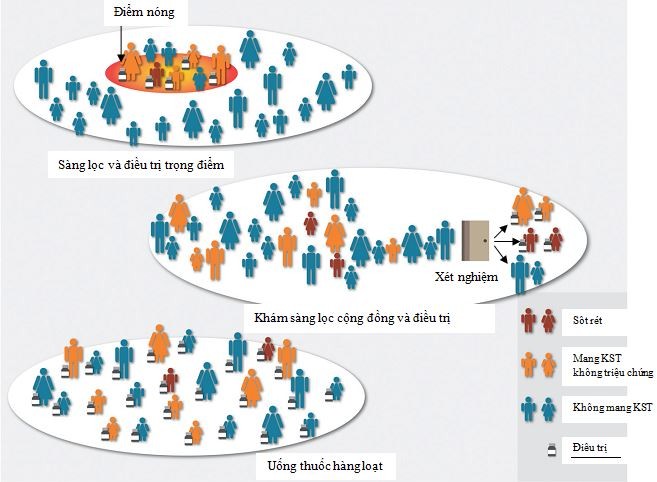 Hình 1. Mô hình thể hiện sự khác biệt giữa các phương pháp điều trị khác nhau: kiểm tra trọng điểm và điều trị, khám sàng lọc cộng đồng và điều trị nhắm mục tiêu, sàng lọc tất cả các cá nhân trong một khu vực nhất định và sau đó xử lý người mang KST và dùng thuốc hàng loạt.