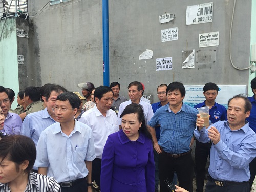 Hình 2. Bộ trưởng Bộ Y tế Nguyễn Thị Kim Tiến kiểm tra công tác phòng chống SXH tại phường Hiệp Thành, Quận 12.
