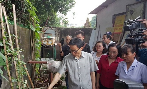 Hình 1. Phó Thủ tướng Vũ Đức Đam kiểm tra công tác phòng chống sốt xuất huyết, nơi ăn ở khu trọ của người dân tại ngõ 121 Chùa Láng