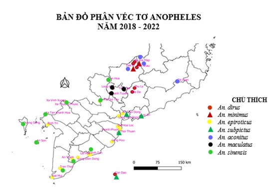 Ở Việt Nam, cho đến nay đã phát hiện được trên 60 loài muỗi Anopheles, 15 loài đã được xác định là véc tơ sốt rét chính, véc tơ phụ và véc tơ nghi ngờ. Khu vực NB-LĐ sau các đợt điều tra, đã xác định sự có mặt 03 loài là véc tơ sốt rét chính là: An. dirus, An. minimus, An. epiroticus.Trong đó, An. dirustìm thấy ở xã Bù Gia Mập, huyện Bù Gia Mập, Bình Phước, xã Mã Đà, xã Phú Lý, huyện Vĩnh Cữu, Đồng Nai. An. minimuschỉ tìm thấy ở xã Bù Gia Mập. An. epiroticuschỉ tìm thấy ở các tỉnh ven biển nước lợ như: Bến Tre, Trà Vinh, Sóc Trăng, Bạc Liêu, Cà Mau, Kiên Giang. An. aconitustìm thấy ở xã Bù Gia Mập, huyện Bù Gia Mập, Bình Phước, xã Đà Loan, huyện Đức Trọng, Lâm Đồng. An. subpictustìm thấy xã Lộc An, huyện Đất đỏ, BR-VT, xã An Thới Đông, huyện Cần Giờ, TP.HCM, xã Thới Thuận, huyện Bình Đại, Bên Tre. An. maculatustìm thấy ở xã Thanh Tuyền, xã Long Hòa, huyện Dầu Tiếng, Bình Dương, xã Tam Lập, huyện Phú Giáo, Bình Dương.