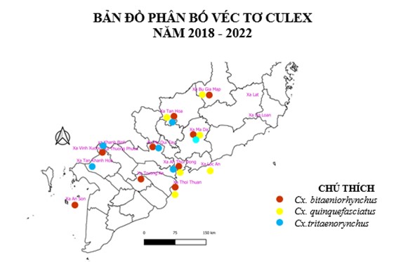 Ở Việt Nam có khoảng 28 loài, tại ở khu vực Nam Bộ - Lâm Đồng có 25 loài, thuộc giống Culex. Trong đó có 05 loài truyền viêm não Nhật Bản, 04 loài truyền giun chỉ bạch huyết và 02 loài vừa truyền viêm não vừa truyền giun chỉ bạch huyết ở Việt Nam. Khu vực NB-LĐ sau các đợt điều tra, đã xác định sự có mặt 03 loài là véc tơ là: Cx. bitaeniorhynchus, Cx.tritaenorynchus, Cx. quinquefasciatus.Xã Mã Đà, huyện Vĩnh Cữu, Đồng Nai, xã Tân Hòa, huyện Tân Châu, Tây Ninh, xã An Thới Đông, huyện Cần Giờ, TP.HCM có mặt 03 loài này. Xã Bù Gia Mập, xã Thới Thuận, xã Khánh Bình, xã Vĩnh Xương, xã Thường Phước có 02 loài.