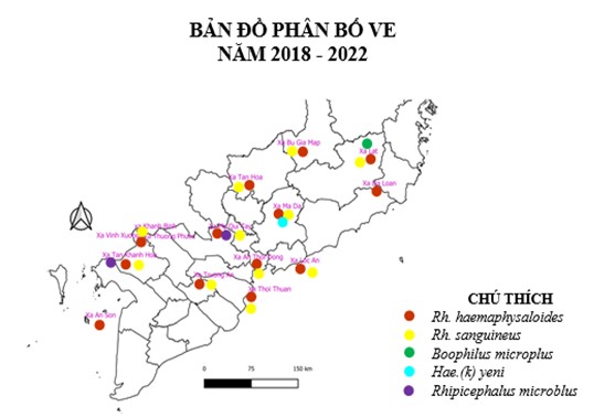 Khu vực NB-LĐ sau các đợt điều tra, đã xác định sự có mặt 05 loài ve /09 (NB-LĐ). Bao gồm các loài: Rh. haemaphysaloides, Rh. sangiuneus, Boophilus microplus, Hae. (K). yeni, Rh. microplus. Loài Rh. haemaphysaloides, Rh. sangiuneusđược tìm thấy khá phổ biến hầu như có hiện diện khắp nơi. Loài Hae. (K). yeni,chỉ tìm thấy ở xã Mã Đà, huyện Vĩnh Cữu, Đồng Nai, Boophilus micropluschỉ tìm thấy ở xã Lat, huyện Đơn Dương, Lâm Đồng