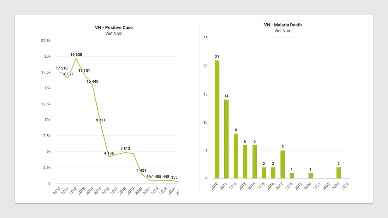 Trong 25 năm qua số bệnh nhân sốt rét và tử vong do sốt rét tại Việt Nam giảm dần qua các năm, có thể chia làm 3 giai đoạn (giai đoạn 2010 - 2014, từ 2015 - 2019 và từ 2020 - 2024) theo số liệu từ chương trình loại trừ sốt rét ở các nước tiểu vùng sông Me Kông, như hình 1.