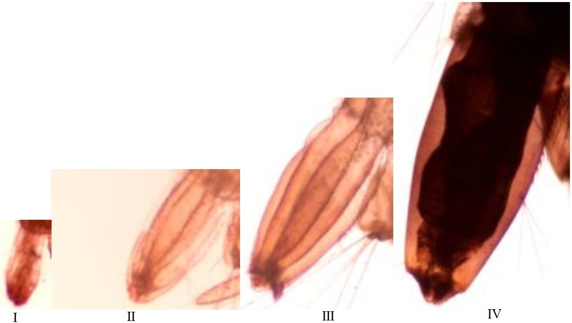 Hình 13.Mai hậu môn của bọ gậy Ae. aegypti (giai đoạn I–IV), phóng đại 108 lần.