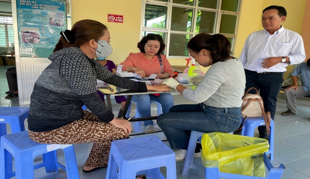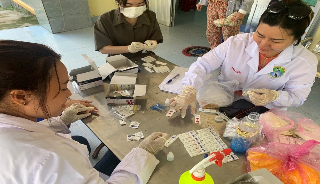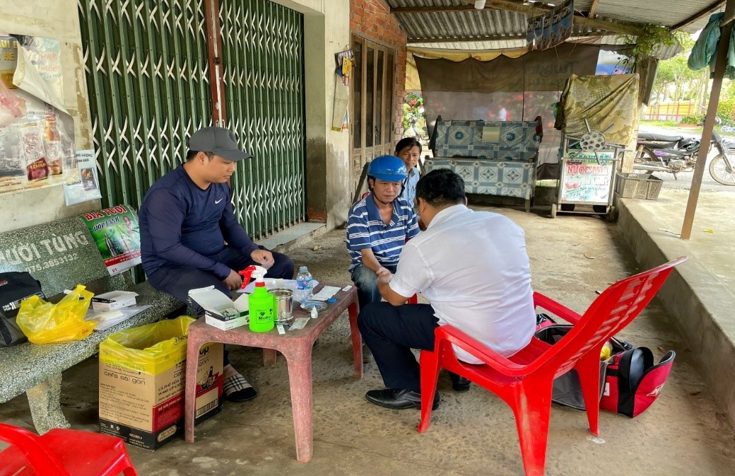 Thực hiện hoạt động điều tra chủ động ký sinh trùng sốt rét ở vùng sốt rét lưu hành cũ Tỉnh Bến Tre theo Quyết định số 1423/QĐ-BYT ngày 27/5/2024 của Bộ Y tế, Viện Sốt rét - Ký sinh trùng - Côn trùng TP. Hồ Chí Minh phối hợp TTKSBT Tỉnh Bến Tre, Trung tâm y tế Huyện Bình Đại và Trạm Y tế Xã Châu Hưng (Đoàn công tác) thực hiện xét nghiệm KSTSR các đối tượng nguy cơ bằng test nhanh và thu thập giấy thấm Whatman 3MM để làm xét nghiệm sinh học phân tử.