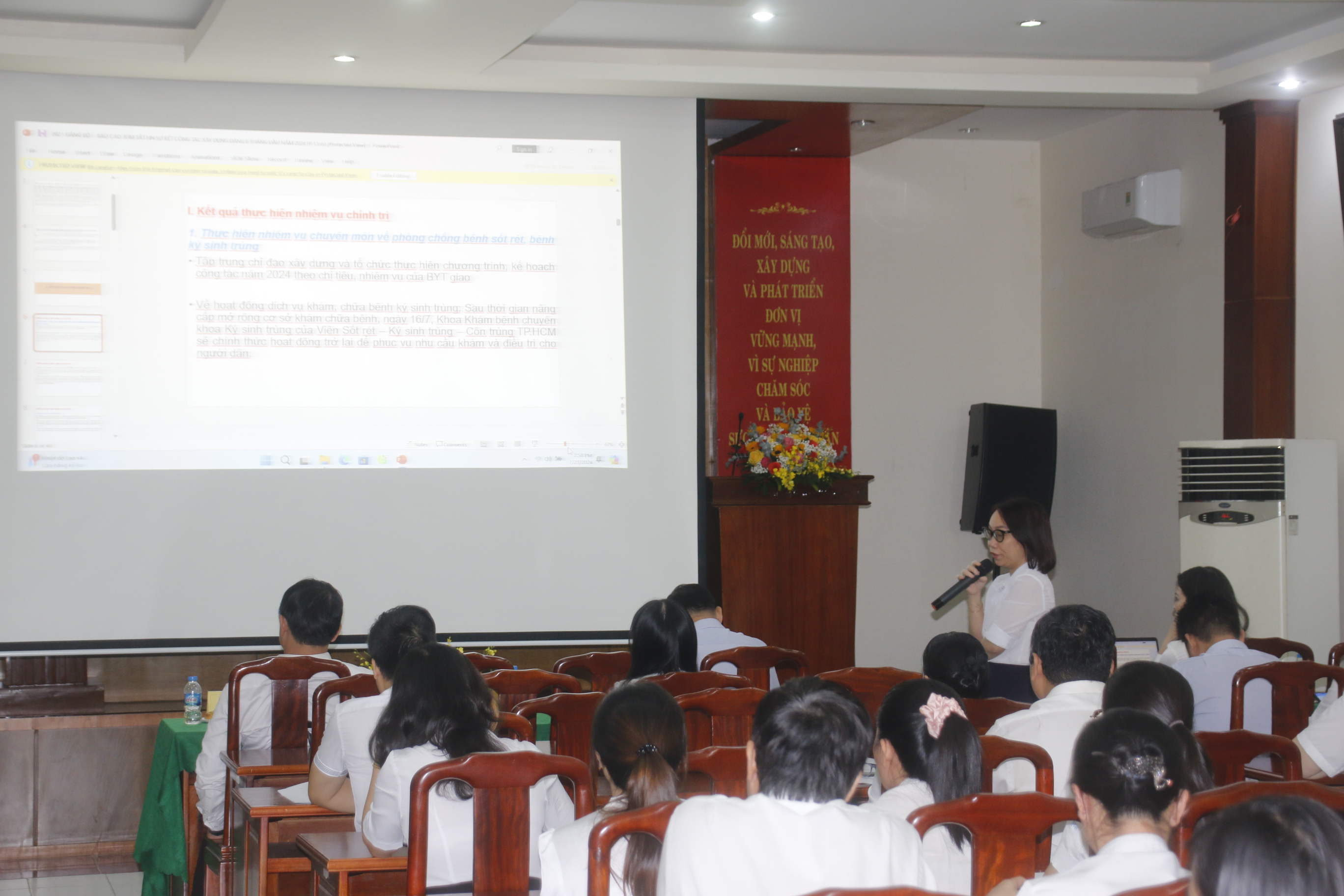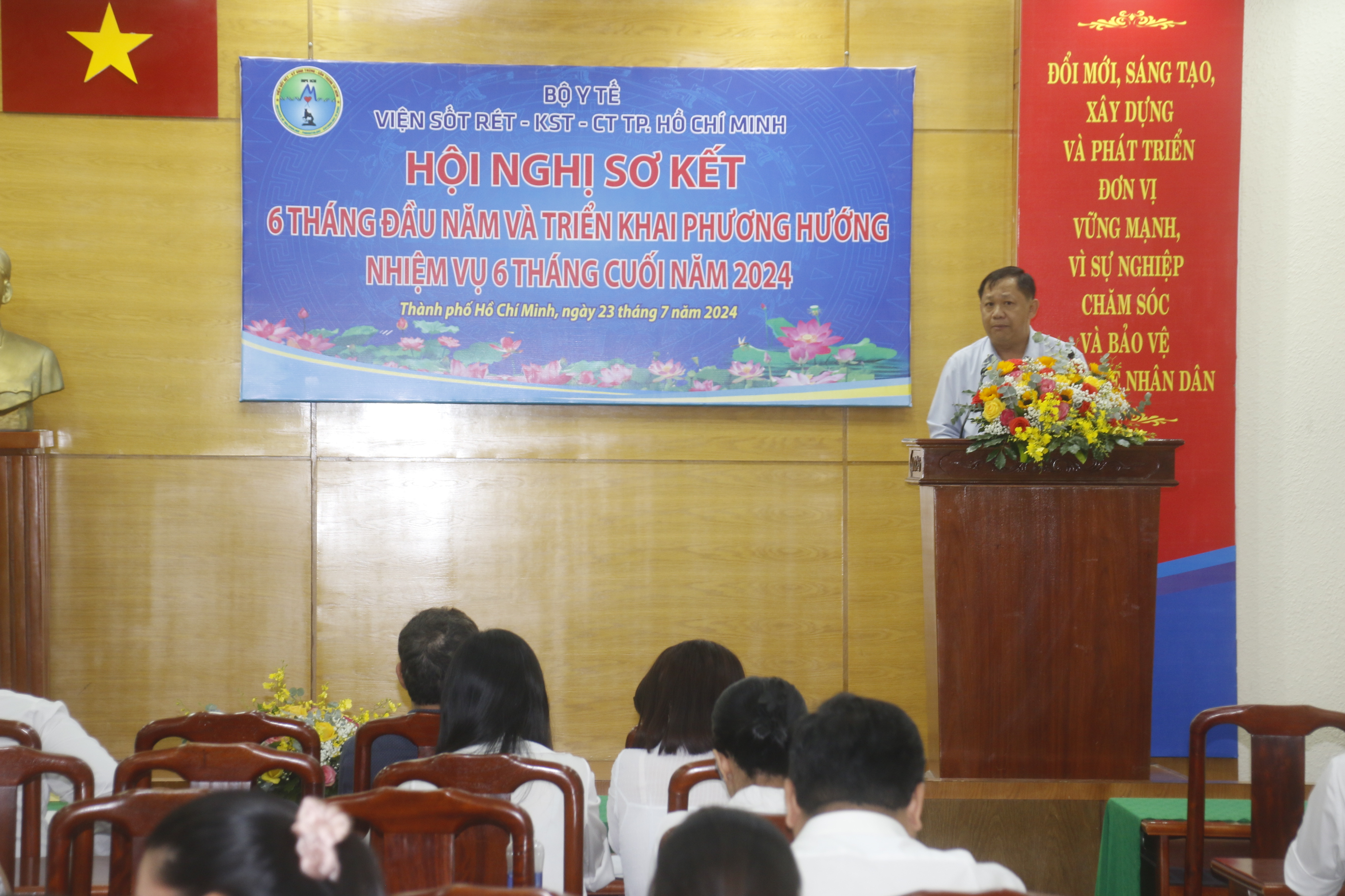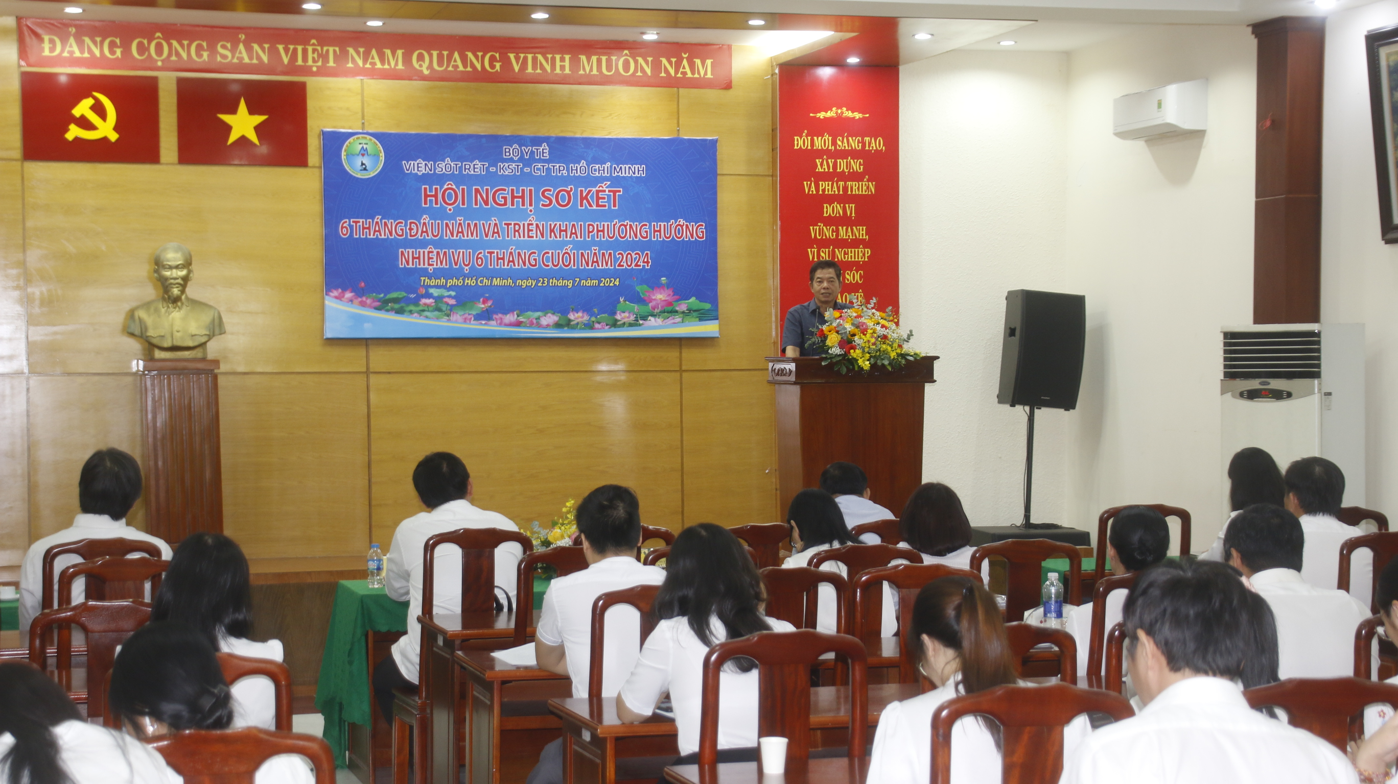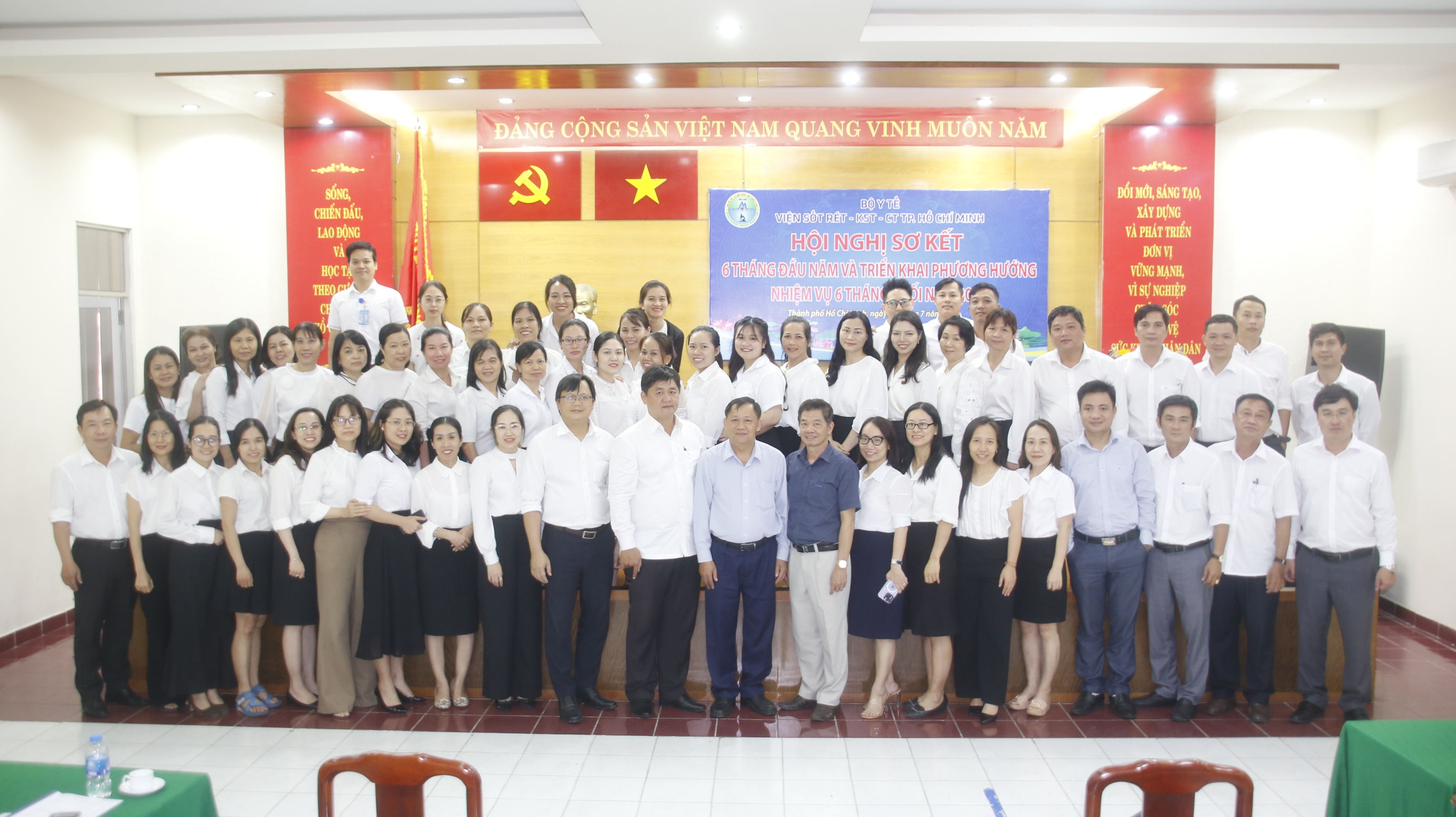 Ngày 23 tháng 7 năm 2024, Viện Sốt rét - Ký sinh trùng - Côn trùng TP.HCM đã tổ chức hội nghị sơ kết 6 tháng đầu năm 2024 và định hướng nhiệm vụ cho 6 tháng cuối năm. Hội nghị có sự tham dự của ông Lê Việt Hoàng, Phó Ban tổ chức Đảng ủy Khối cơ sở Bộ Y tế; TS. Giang Hán Minh Bí thư Đảng uỷ, Phó Viện trưởng phụ trách điều hành Viện; ThS. Đỗ Thị Phượng Linh - Phó Bí thư Đảng uỷ Viện; TS. Đoàn Bình Minh, Phó Viện trưởng và toàn thể VC - NLĐ Viện Sốt rét - KST - CT TP. Hồ Chí Minh.