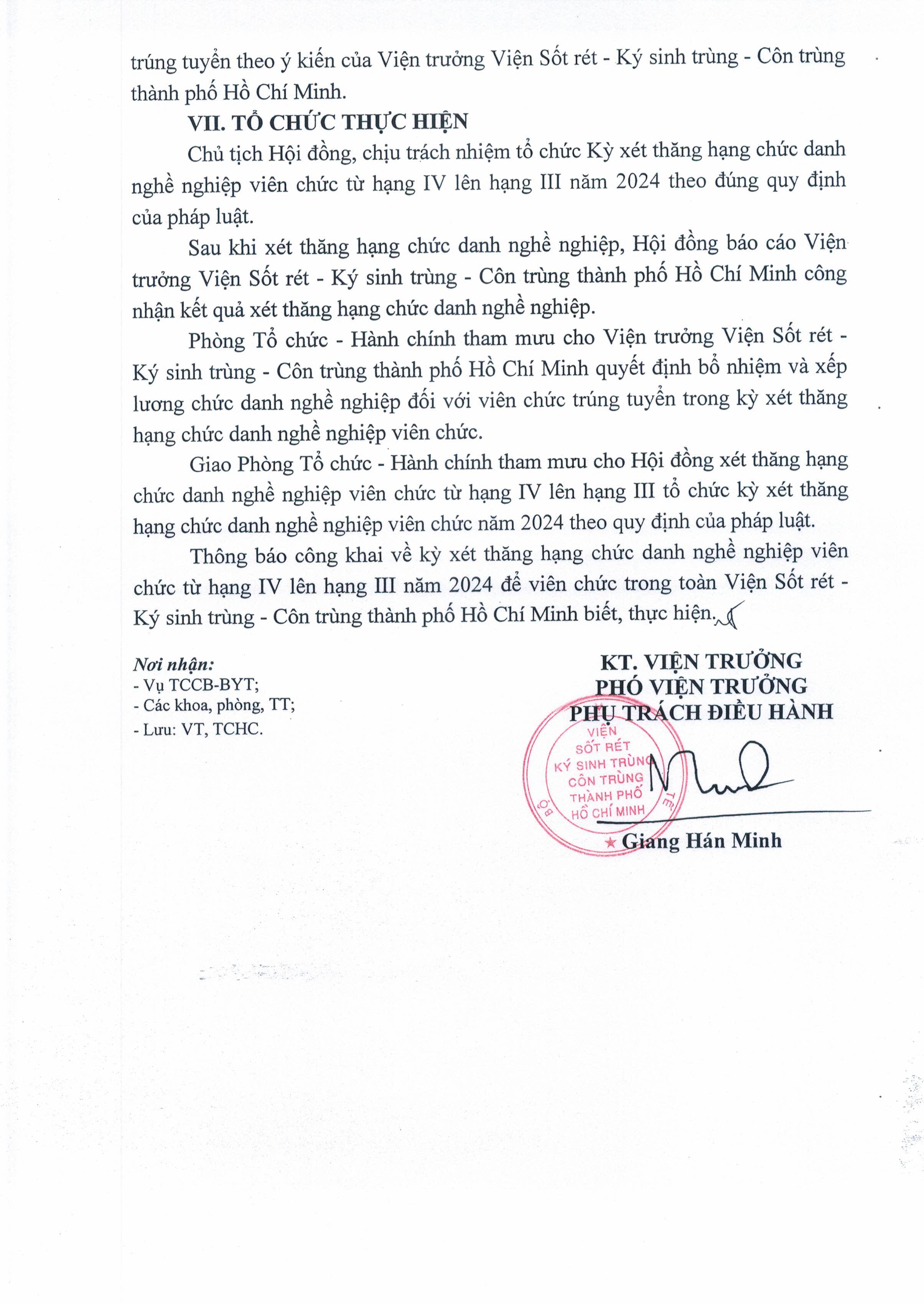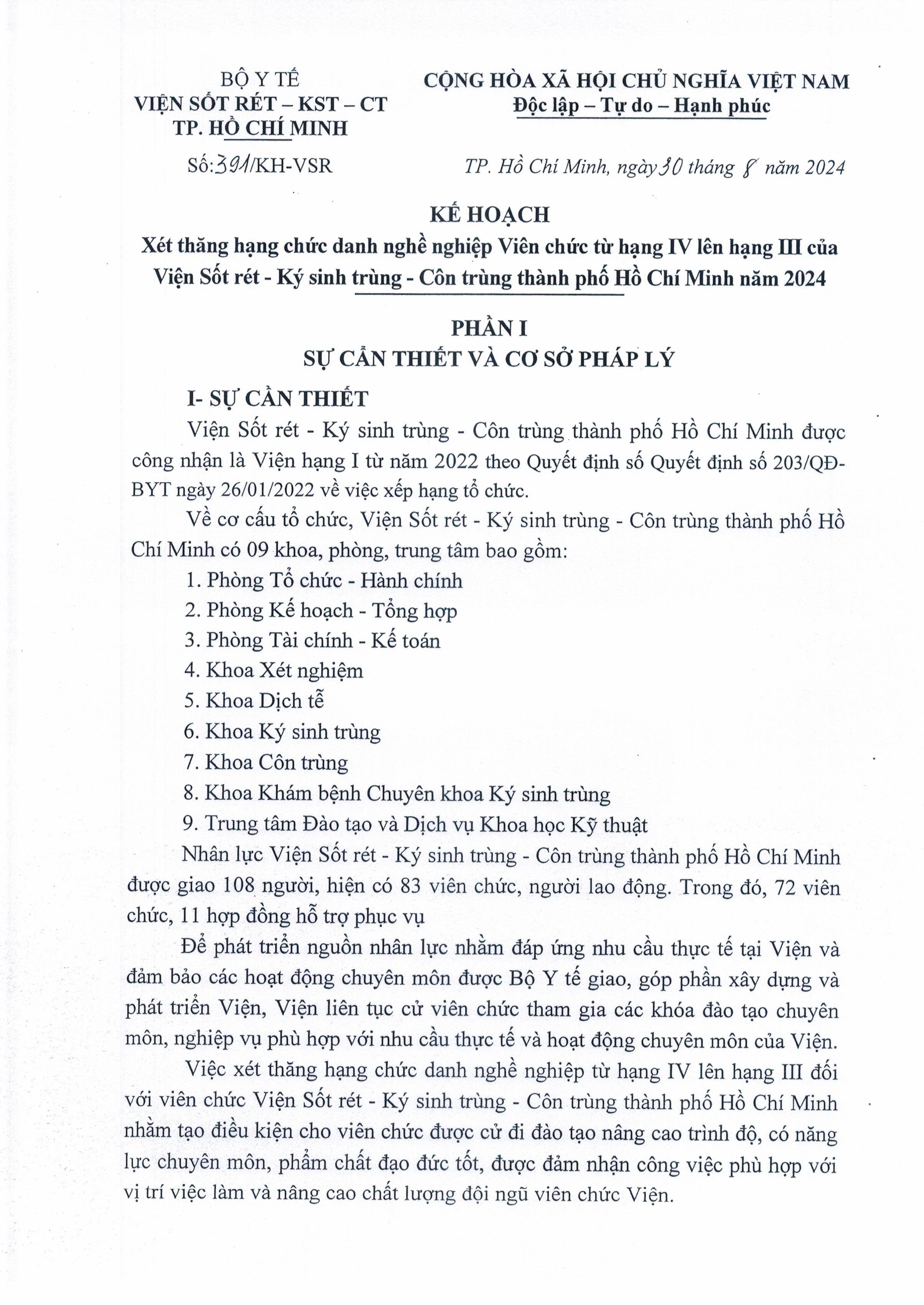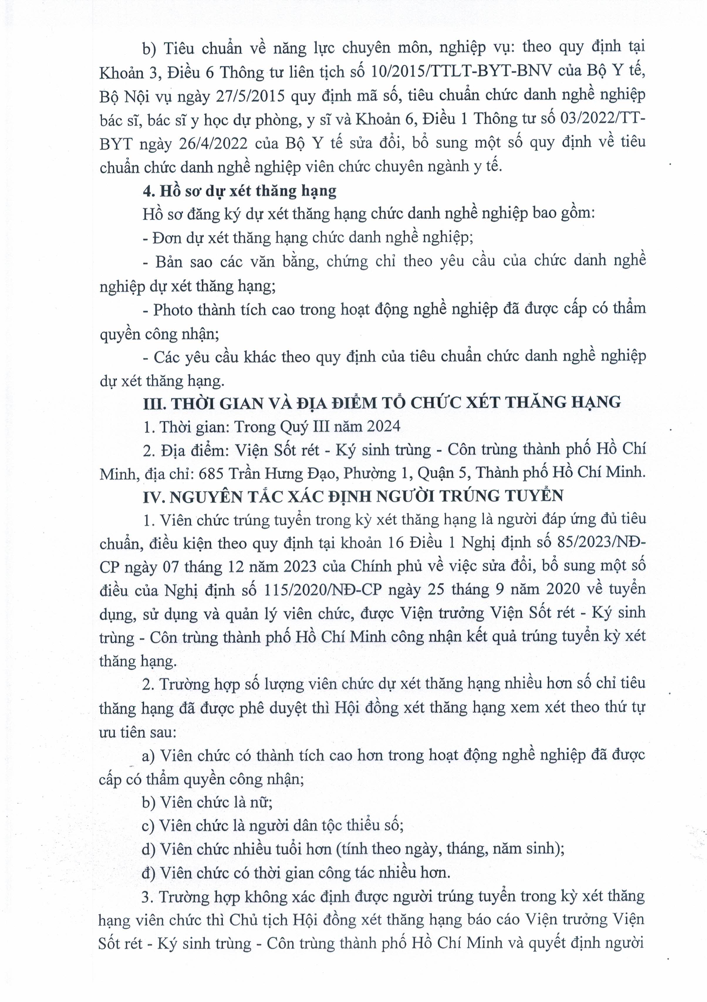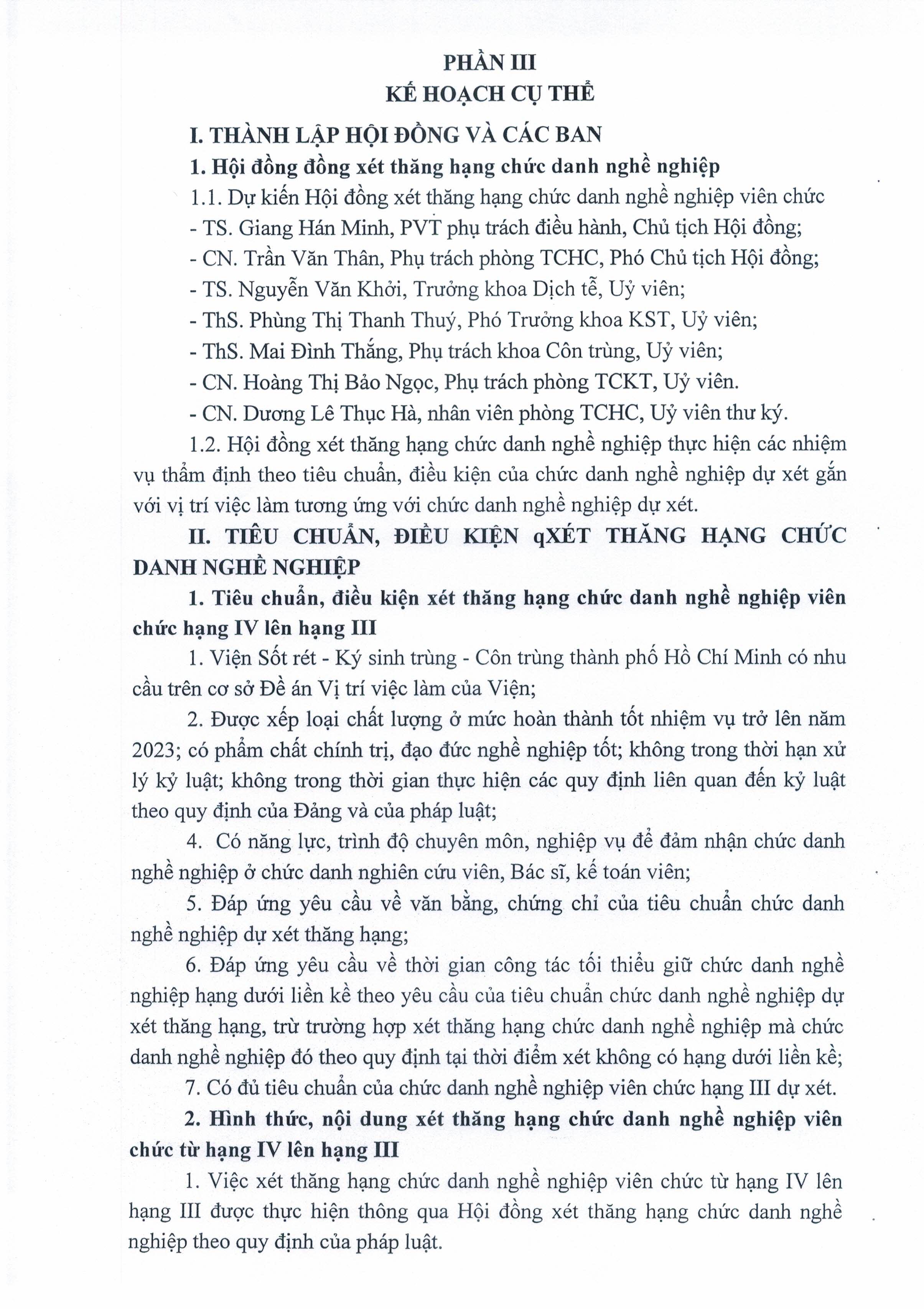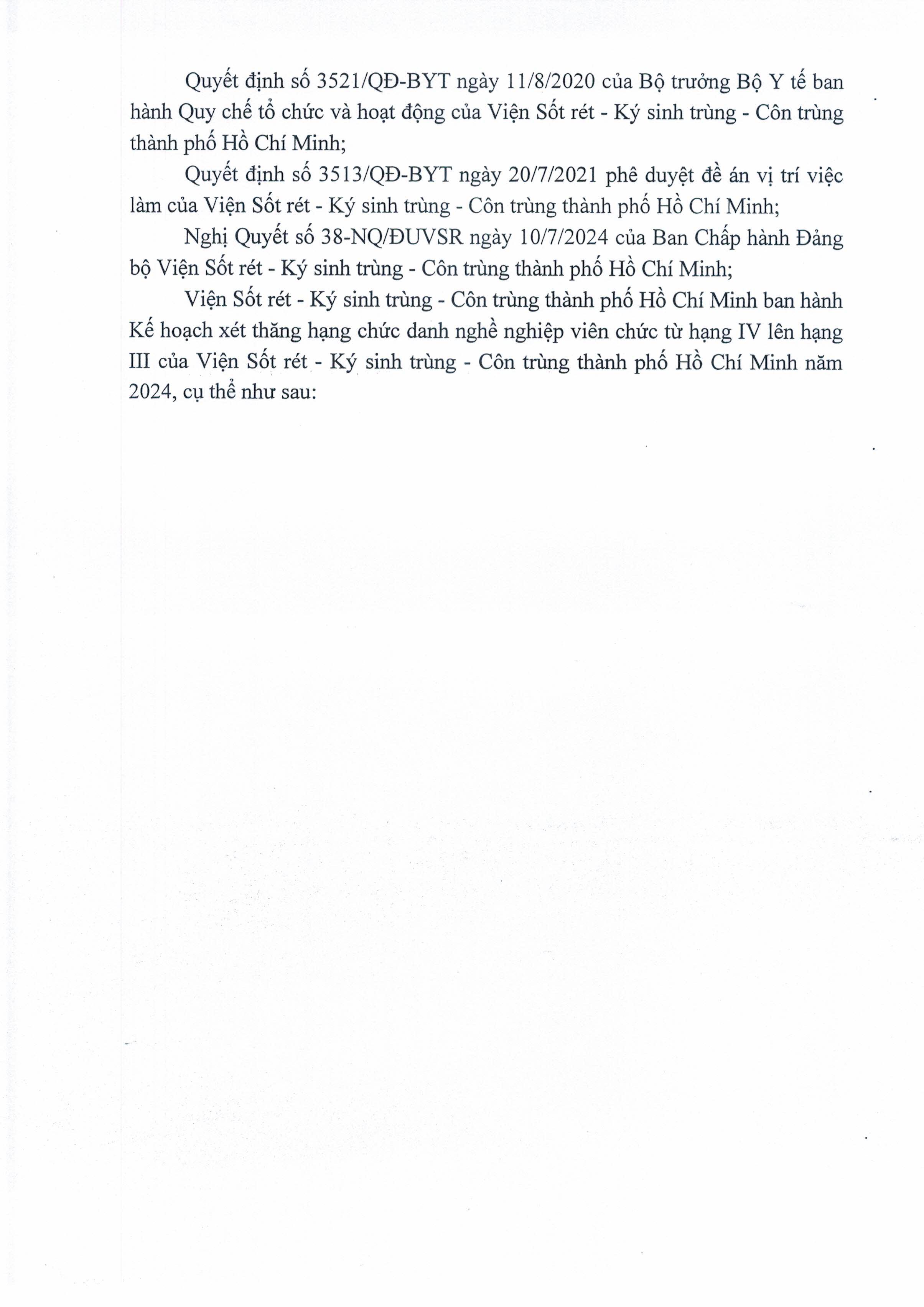 Kế hoạch xét thăng hạng chức danh nghề nghiệp Viên chức từ hạng IV lên hạng III của Viện Sốt rét - Ký sinh trùng - Côn trùng TP.HCM năm 2024