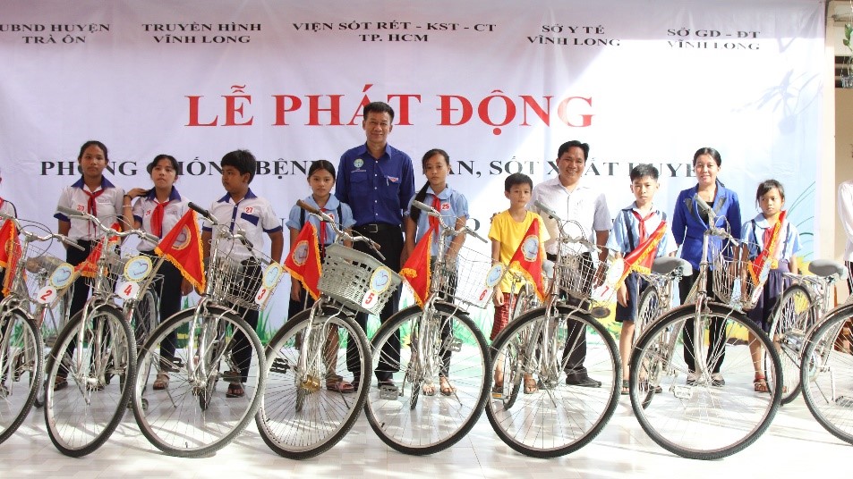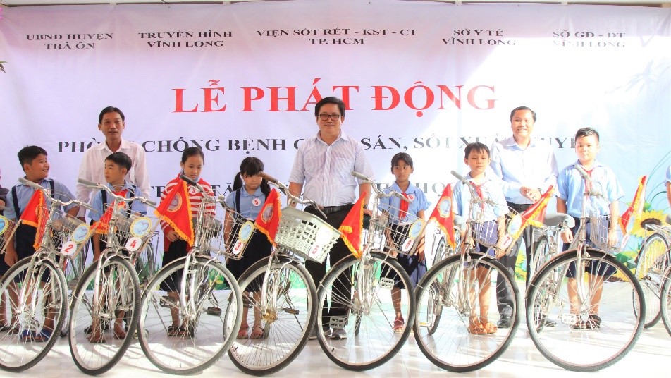 Ngày 13/7/2020, Viện Sốt rét - KST - CT TP.HCM phối hợp với Sở Y tế tỉnh Vĩnh Long, Sở Giáo dục và Đào tạo tỉnh Vĩnh Long, Trung tâm Kiểm soát bệnh tật tỉnh Vĩnh Long và các cơ quan đơn vị, chính quyền địa phương ở Huyện Trà Ôn, Xã Tân Mỹ tổ chức Lễ phát động Phòng chống bệnh giun, sán; bệnh sốt xuất huyết kết hợp Trao tặng xe đạp đến trường cho 50 em học sinh Xã Tân Mỹ.