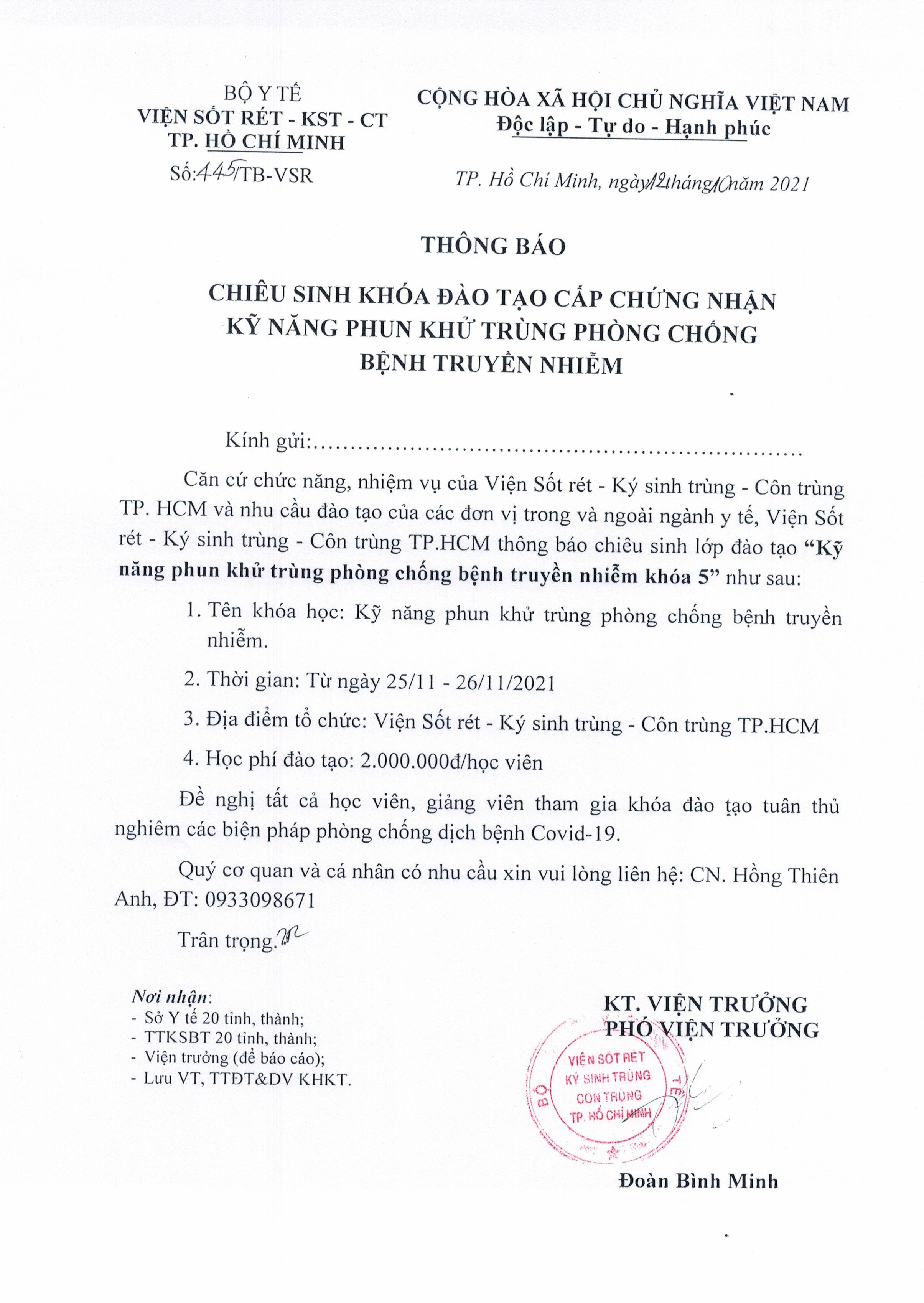 THÔNG BÁO CHIÊU SINH KHÓA ĐÀO TẠO CẤP CHỨNG NHẬN KỸ NĂNG PHUN KHỬ TRÙNG PHÒNG CHỐNG BỆNH TRUYỀN NHIỄM