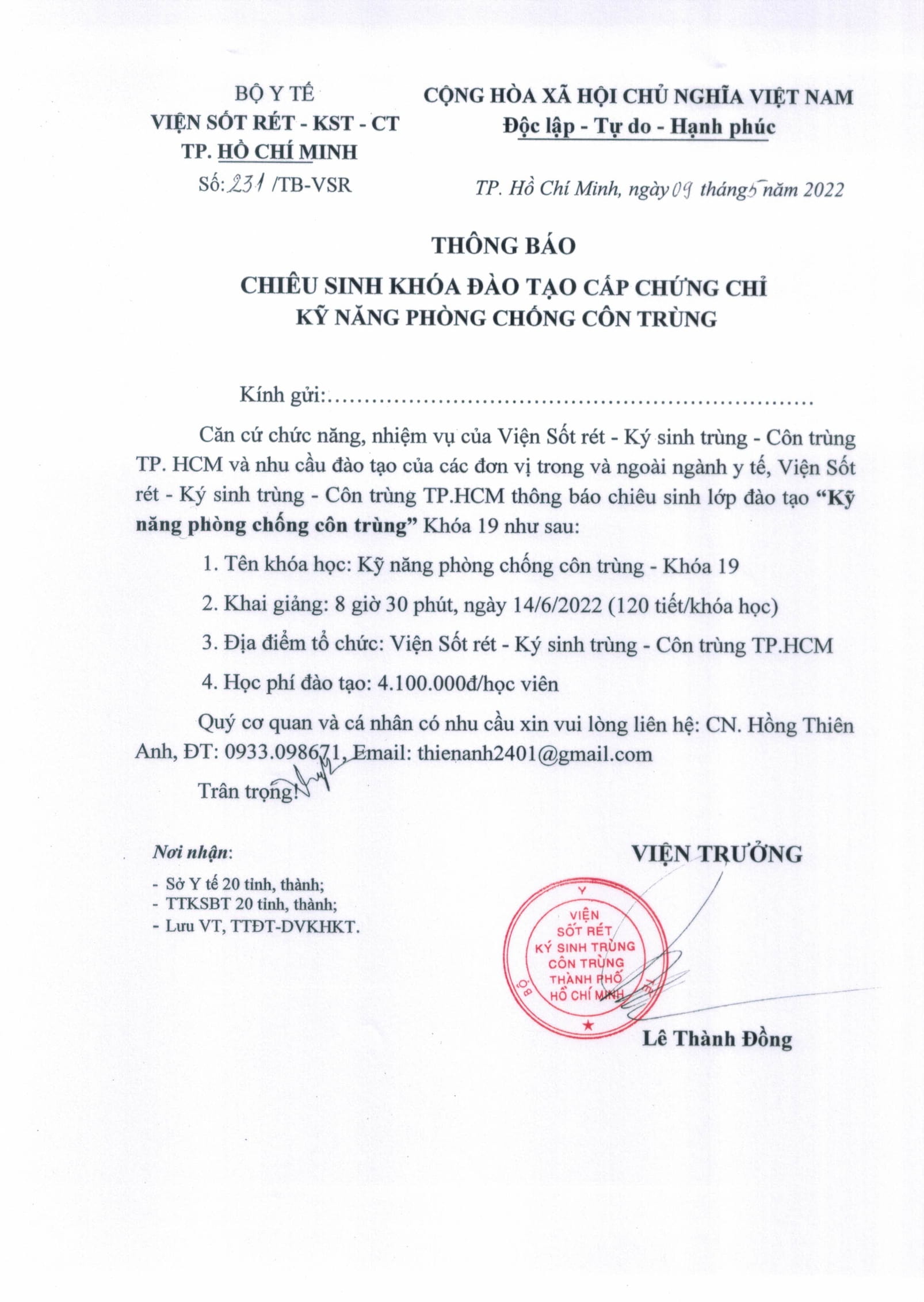 THÔNG BÁO CHIÊU SINH LỚP kỸ NĂNG PHÒNG CHỐNG CÔN TRÙNG - KHÓA 19