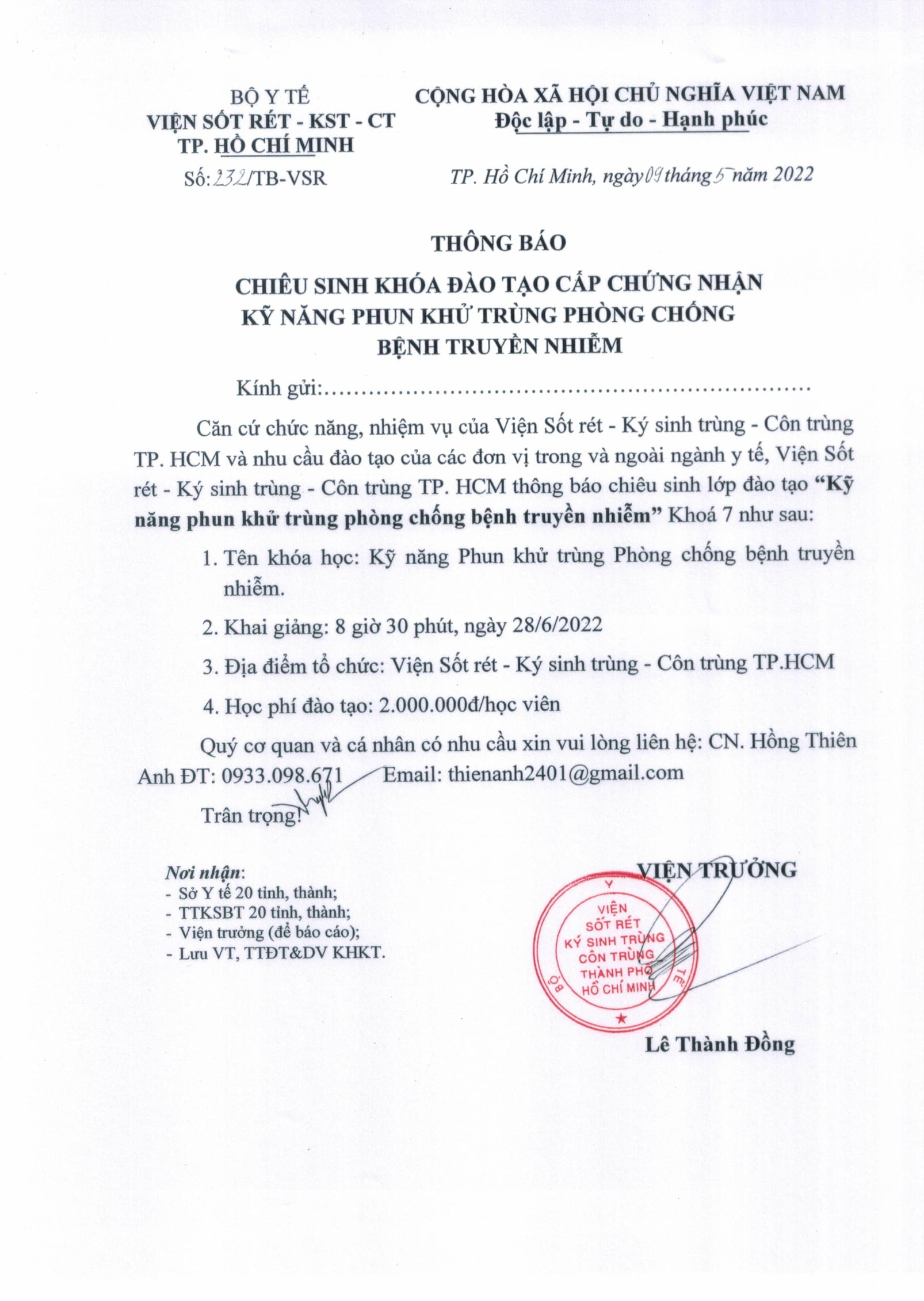 THÔNG BÁO CHIÊU SINH LỚP PHUN KHỬ TRÙNG PHÒNG CHỐNG BỆNH TRUYỀN NHIỄM - KHÓA 7