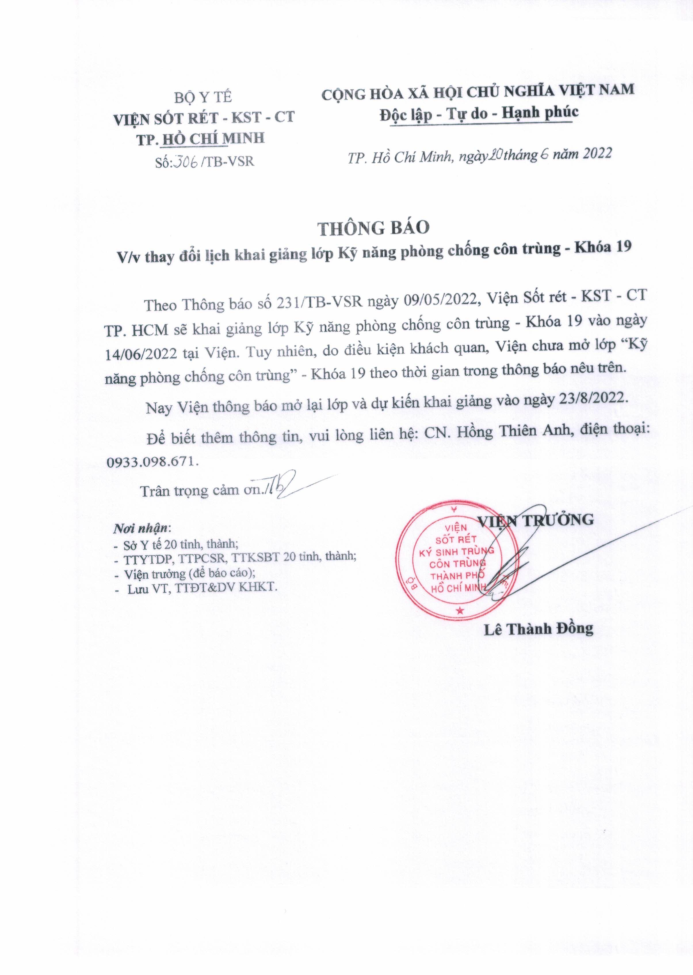 THÔNG BÁO THAY ĐỔI LỊCH KHAI GIẢNG LỚP KỸ NĂNG PHÒNG CHỐNG CÔN TRÙNG - Khoá 19