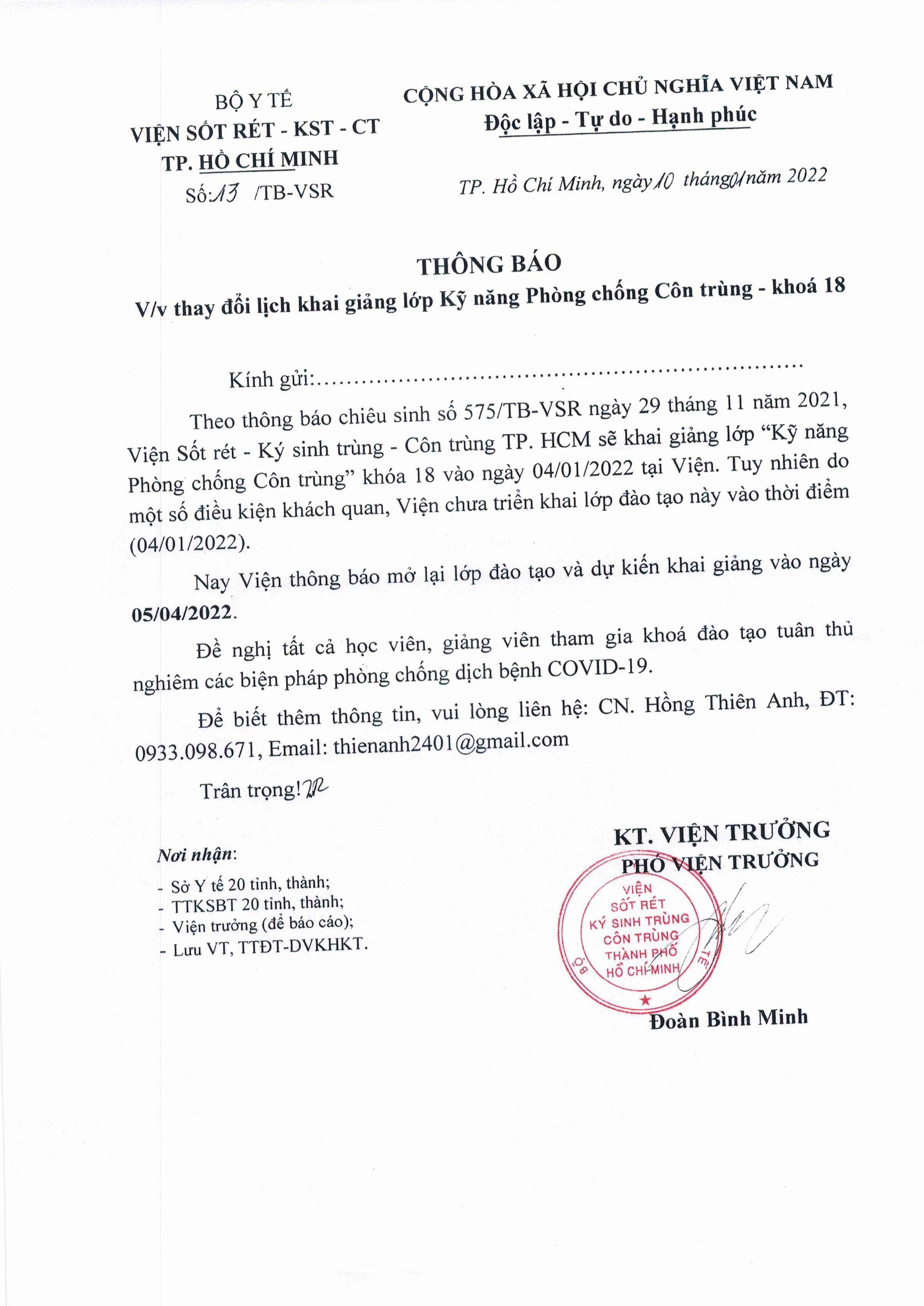 THÔNG BÁO THAY ĐỔI LỊCH KHAI GIẢNG LỚP KỸ NĂNG PHÒNG CHỐNG CÔN TRÙNG