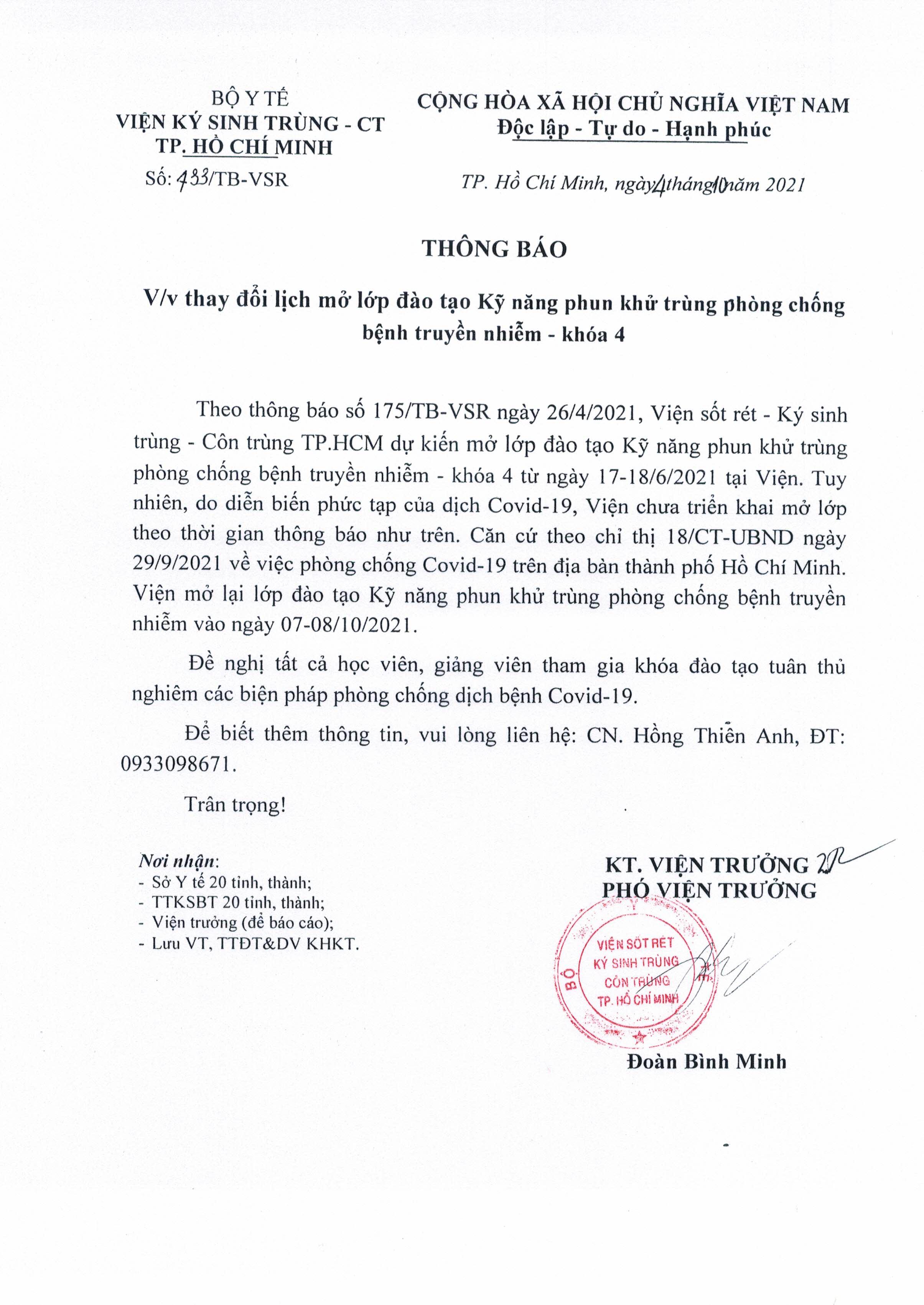 THÔNG BÁO VỀ VIỆC THAY ĐỔI LỊCH MỞ LỚP ĐÀO TẠO "KỸ NĂNG PHUN KHỬ TRÙNG PHÒNG CHỐNG BỆNH TRUYỀN NHIỄM"
