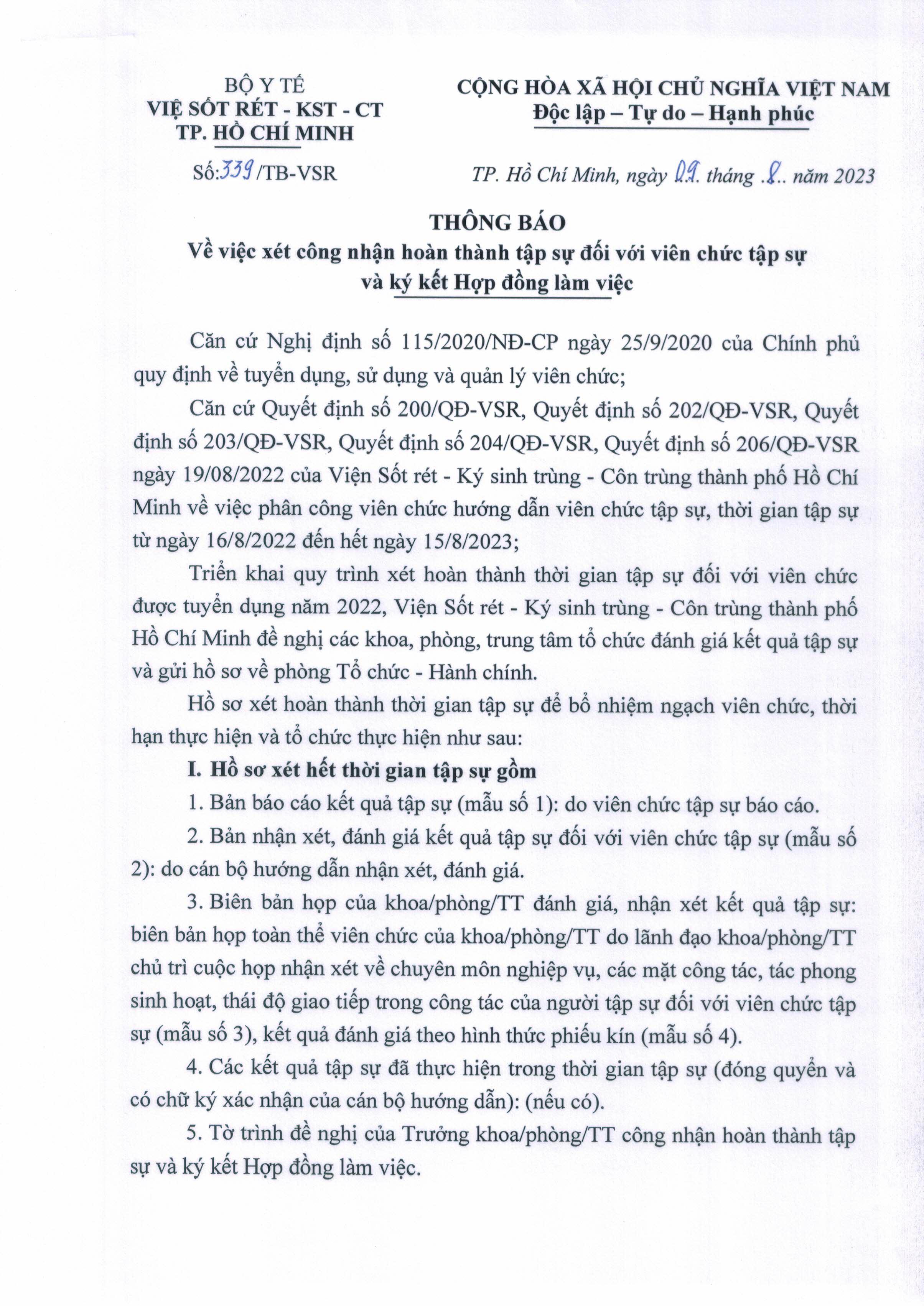 THÔNG BÁO VỀ VIỆC XÉT CÔNG NHẬN HOÀN THÀNH TẬP SỰ ĐỐI VỚI VIÊN CHỨC TẬP SỰ