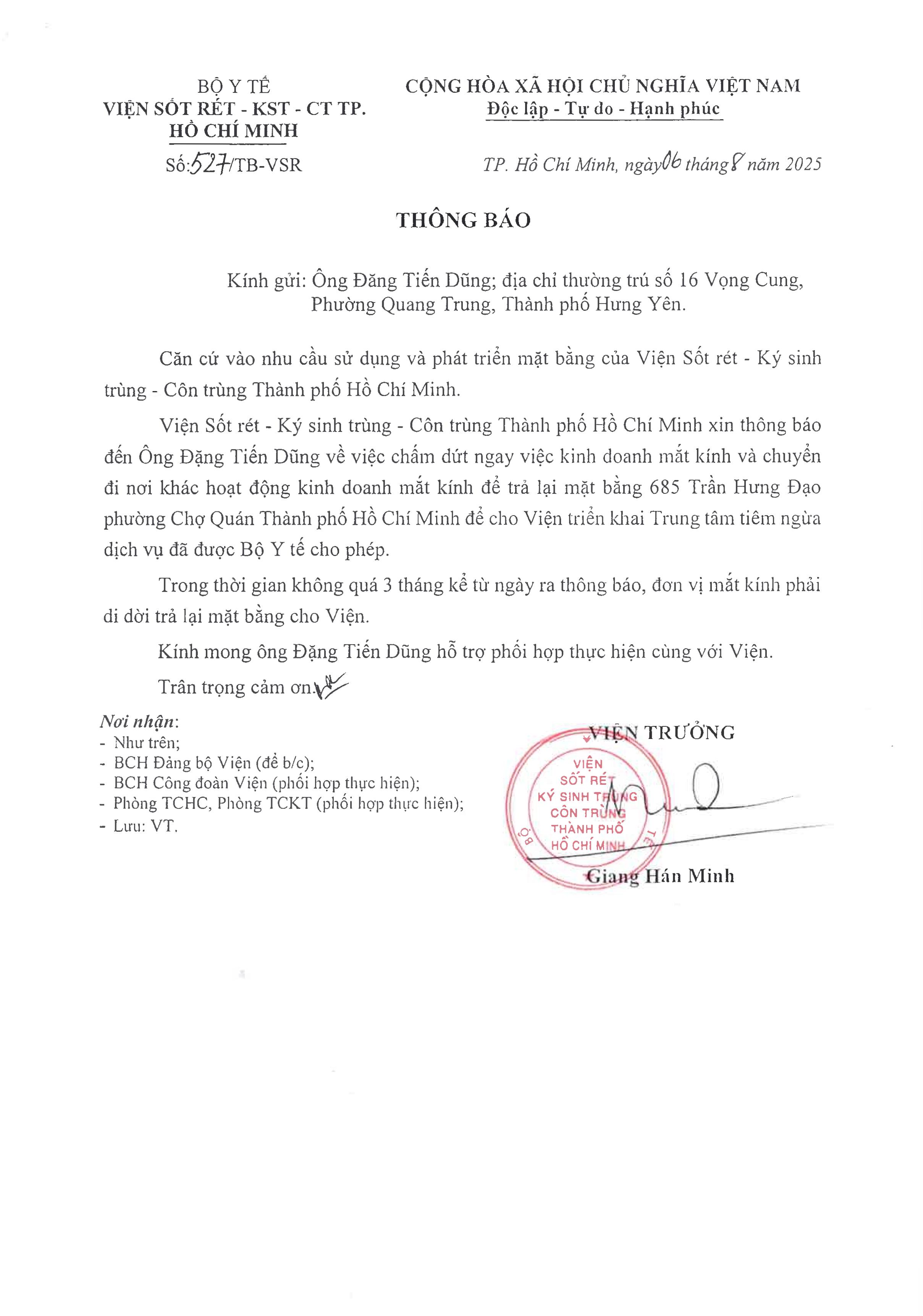 Thông báo về việc yêu cầu cá nhân chấm dứt hoạt đông kinh doanh để trả lại mặt bằng