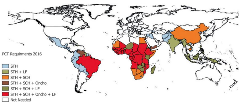 Hình 1.Bản đồ thế giới cho thấy sự phân bố gánh nặng của giun sán về các yêu cầu đối với hóa trị dự phòng (PCT) can thiệp năm 2016. Sau khi khảo sát bản đồ bệnh, các quốc gia đã xác định yêu cầu PCT đối với giun truyền qua đất (STH), bệnh giun chỉ bạch huyết (LF), bệnh onchocerciasis (Oncho) và/hoặc nhiễm Schistosoma(SCH), can thiệp đơn lẻ hoặc kết hợp.