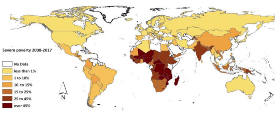 Hình 2. Bản đồ thế giới về tỷ lệ đói nghèo trầm trọng được định nghĩa là phần trăm dân số sống ít hơn 1,9 đô la Mỹ mỗi ngày từ năm 2008 đến 2017 theo dữ liệu của Ngân hàng Thế giới