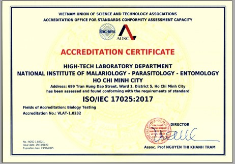 Ngày 29/10/2020, Khoa Xét nghiệm kỹ thuật cao _Viện Sốt rét - KST - CT TP.HCM đạt tiêu chuẩn quốc tế ISO/IEC 17025:2017 do Văn phòng công nhận năng lực đánh giá sự phù hợp về tiêu chuẩn chất lượng (AOSC) cấp. Đây là tiêu chuẩn để các phòng xét nghiệm áp dụng thực hiện cũng như để đánh giá chất lượng các phòng xét nghiệm.