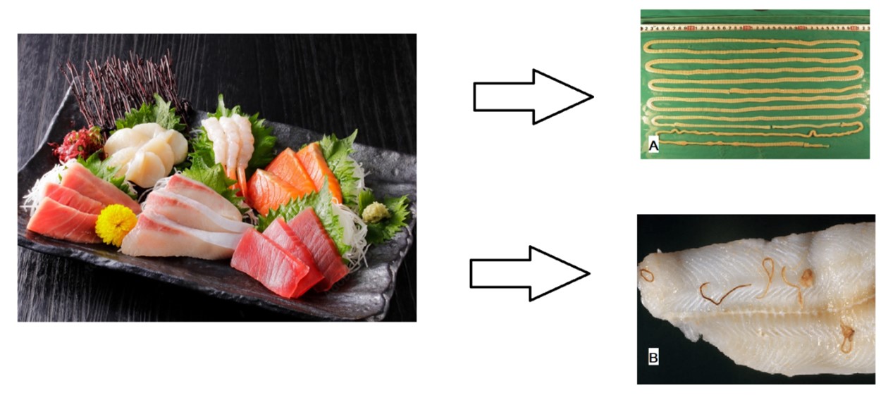 Sashimi là món ăn truyền thống của Nhật Bản, thành phần chính là các loại cá, hải sản sống được thái lát ăn cùng gừng, tía tô, rong biển, … chấm cùng nước tương, wasabi. Thông thường, các loại cá, hải sản này thường được dùng phương pháp đông đá để loại bỏ ký sinh trùng. Phương pháp này theo quy định của Liên hiệp châu Âu là cho cá đông đá ở nhiệt độ -20 °C (-4 °F) trong 24 giờ sẽ diệt được ký sinh trùng; cơ quan quản lý Thực phẩm và Dược phẩm Hoa Kỳ (FDA) thì khuyến cáo đông đá ở nhiệt độ -35 °C (-31 °F) trong 15 giờ, hoặc -20 °C (-4 °F) trong 7 ngày. Tuy nhiên, do sợ ảnh hưởng tới mùi vị và trình bày món ăn, các bước này thường bị bỏ qua trong quá trình sơ chế. Vì thế, đây là nguy cơ lây nhiễm các loại ký sinh trùng như: sán cá (Diphyllobothrium nihonkaiense), giun tròn Anisakis simplex,Pseudoterranova decipiens, … Tại Việt Nam, ngoài cách ăn sashimi với các loại hải sản, người dân còn sử dụng các loài cá nước ngọt để ăn sống kiểu trộn gỏi, đây là nguy cơ lây nhiễm các loài ký sinh trùng như: giun đầu gai (Gnathostoma spinigerum), sán lá gan nhỏ (Clonorchis sinensis), …