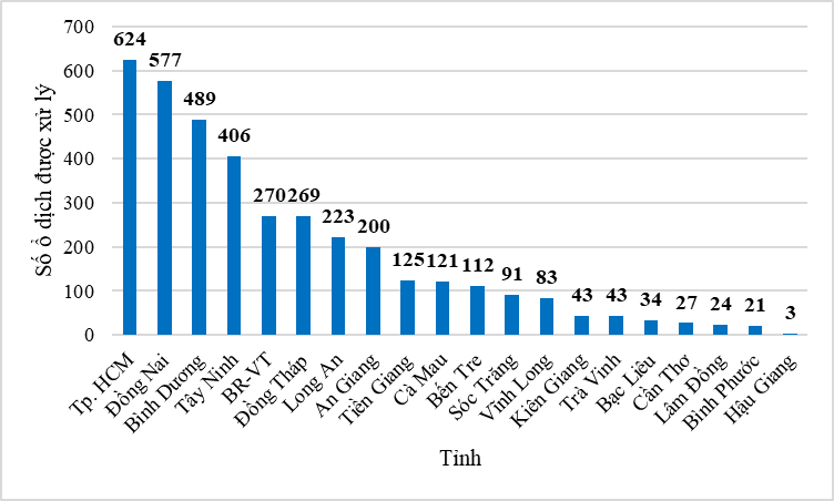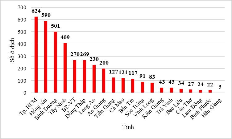 Các ổ dịch được ghi nhận ở khắp 20 tỉnh thành trong khu vực, nhiều nhất ở TP. Hồ Chí Minh (624 ổ dịch), Đồng Nai (590 ổ dịch) và Bình Dương (501 ổ dịch), thấp nhất là ở tỉnh Hậu Giang, tính từ đầu năm đến hết tháng 3/2019 chỉ mới ghi nhận 3 ổ dịch (Biểu đồ 2).