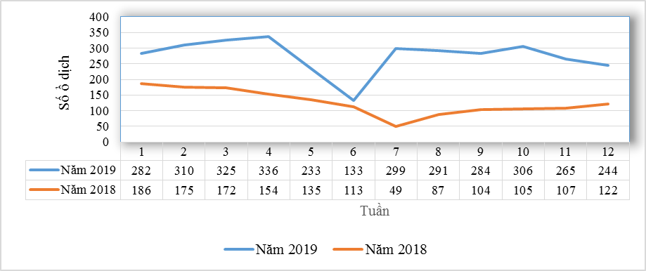 Biểu đồ 1: So sánh diễn biến xảy ra ố ổ dịch SXH ở khu vực Quí I/2019 và Quý I/2018