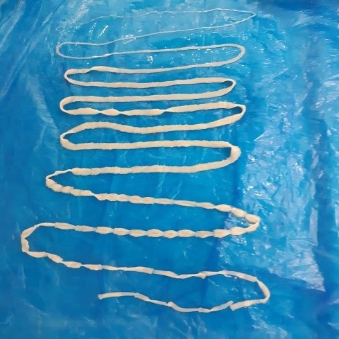 Hình ảnh sán dây trưởng thành sau khi tẩy xổ thành công tại Phòng khám bệnh chuyên khoa Ký sinh trùng, Viện Sốt rét – KST – CT Tp. HCM